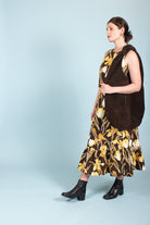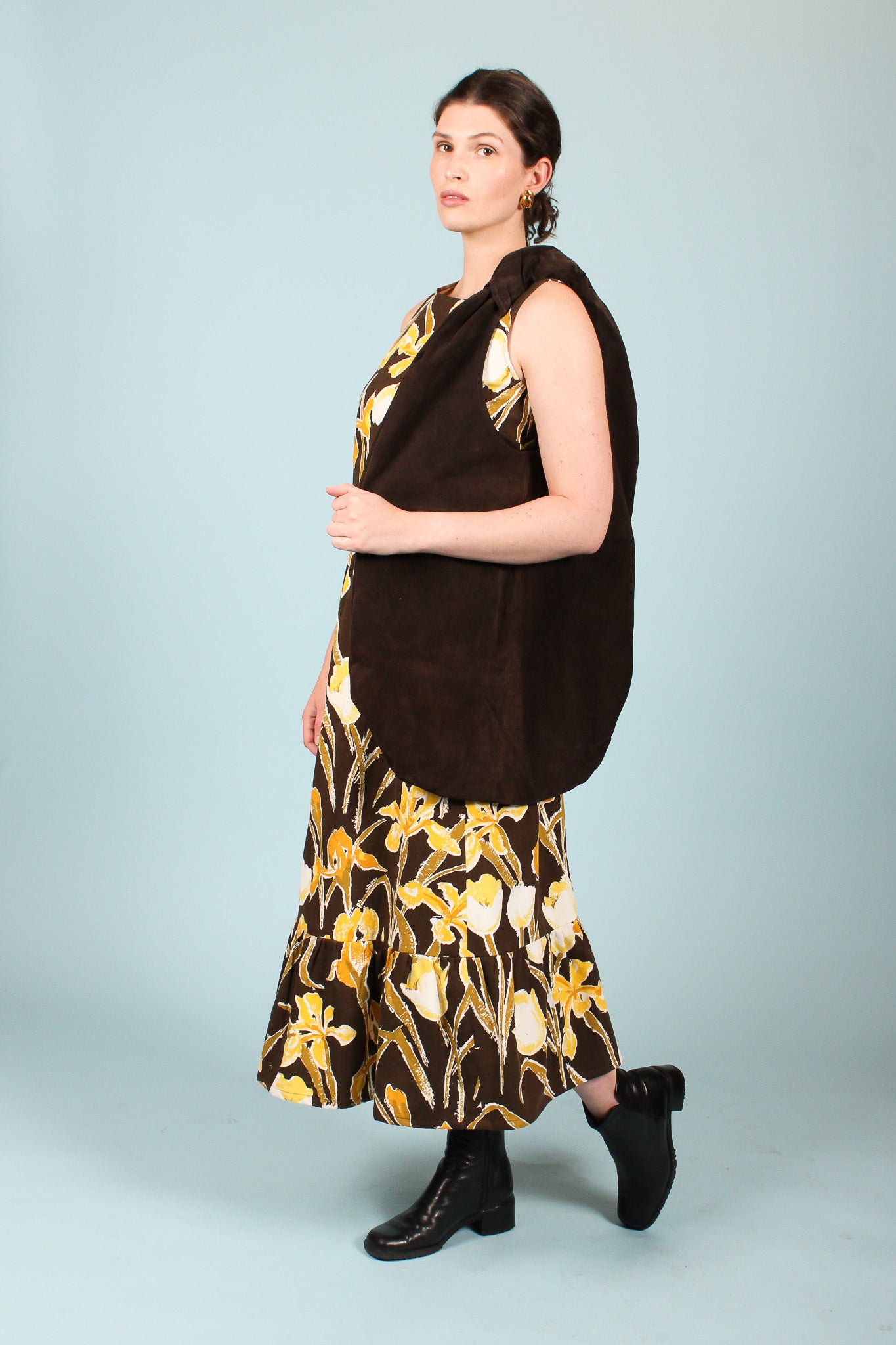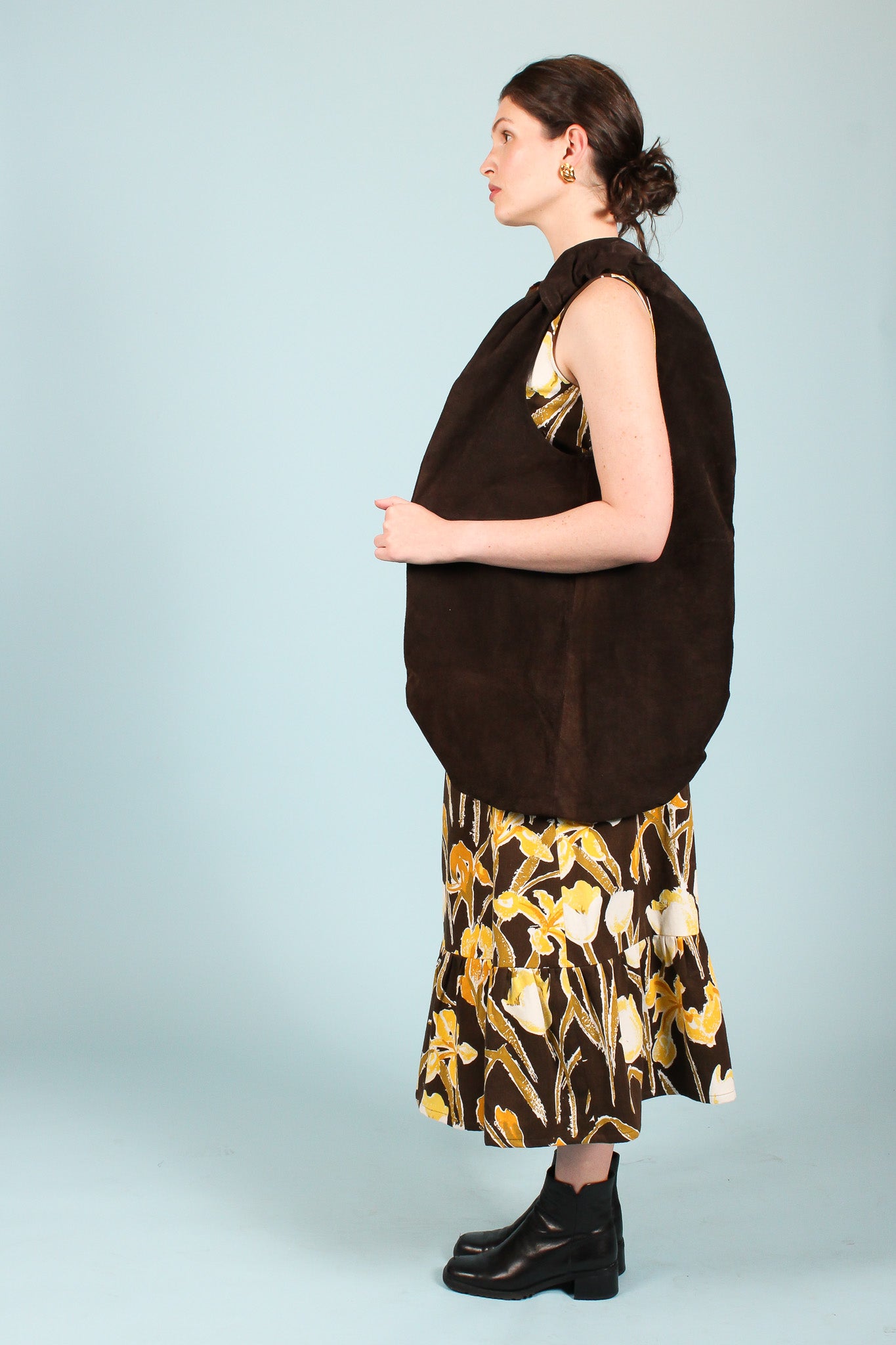 This bold shoulder bag was upcycled here at Community from a vintage suede skirt in a dark chocolate brown. It features an oversized oval shape with a cut out arm hole, and a puff detail on the shoulder. It is fully lined.