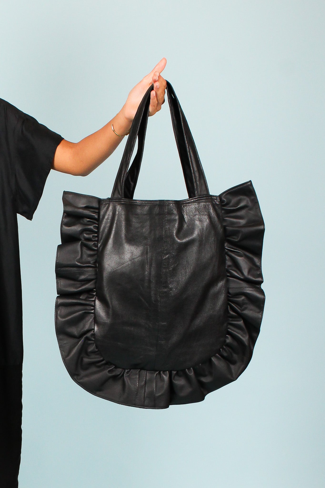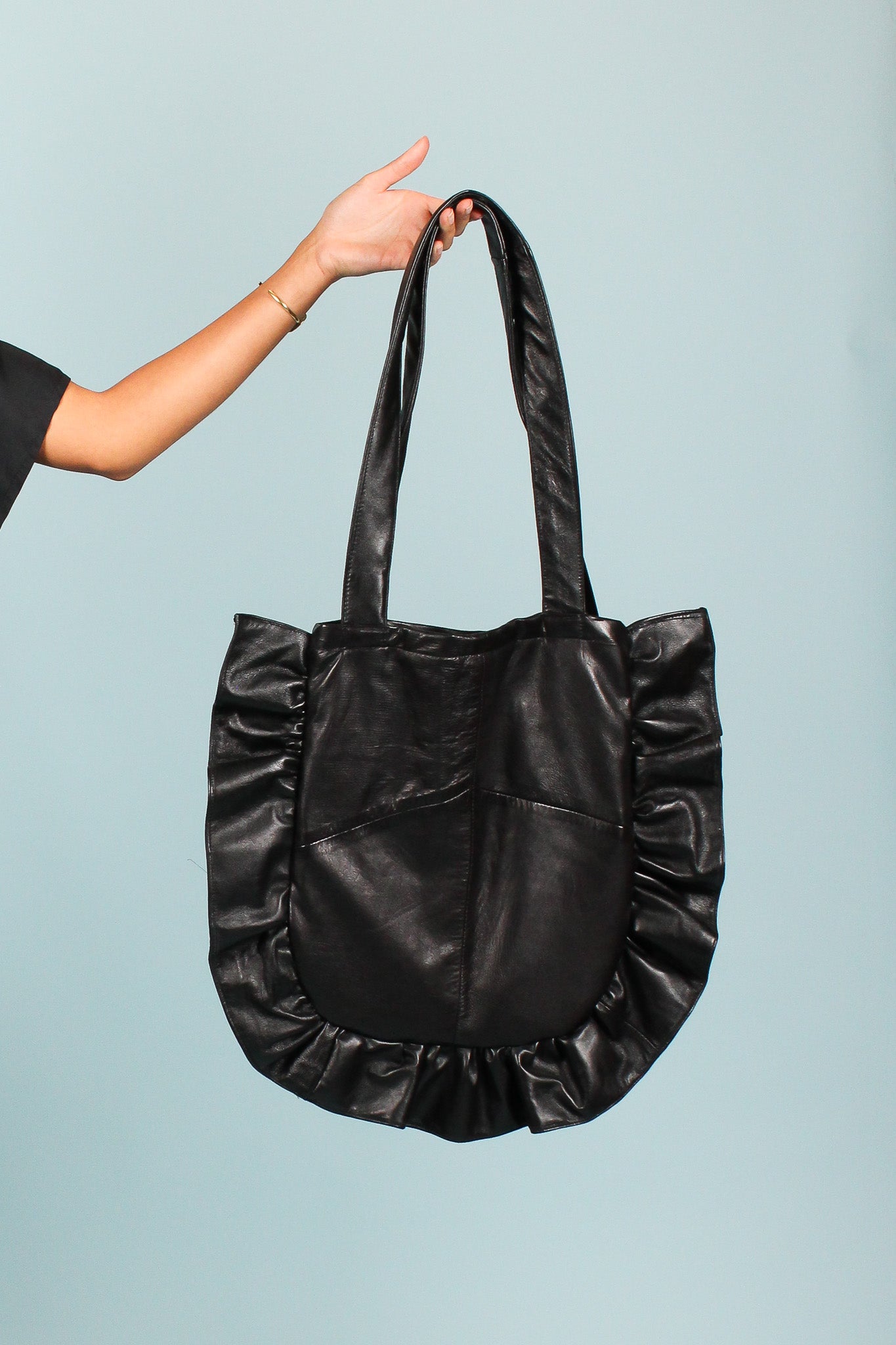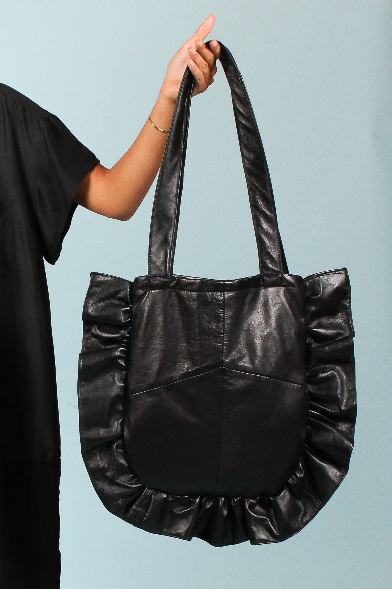 Upcycled Ruffle Leather Shoulder Bag in Ebony