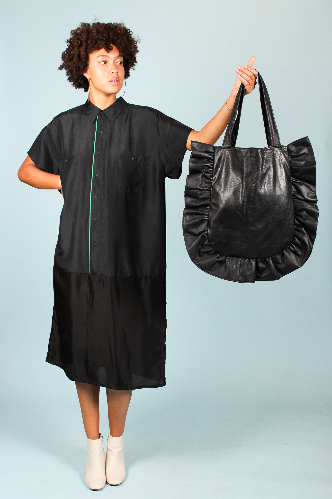 This bold shoulder bag was upcycled here at Community from a vintage leather skirt in a deep, ebony leather. It features two straps (long and short strap versions are available), a ruffle detail along the entire seam of the bag, and a lining with an inner pocket.