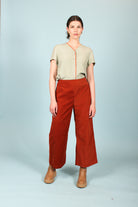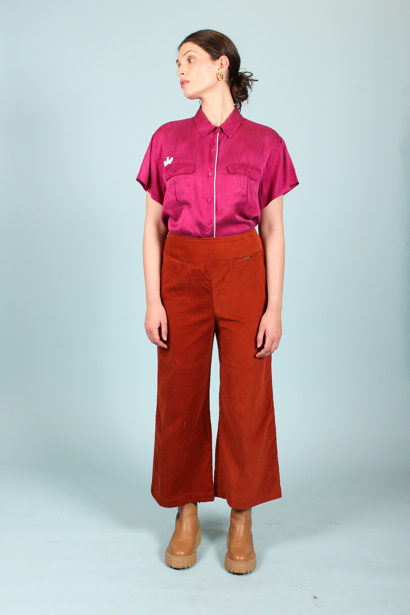 Made from salvaged vintage fabric, these pants feature a side zipper with a wide leg cropped silhouette and a yoke front with two pockets in a bright rusty orange corduroy. Handmade at Community.