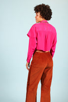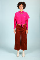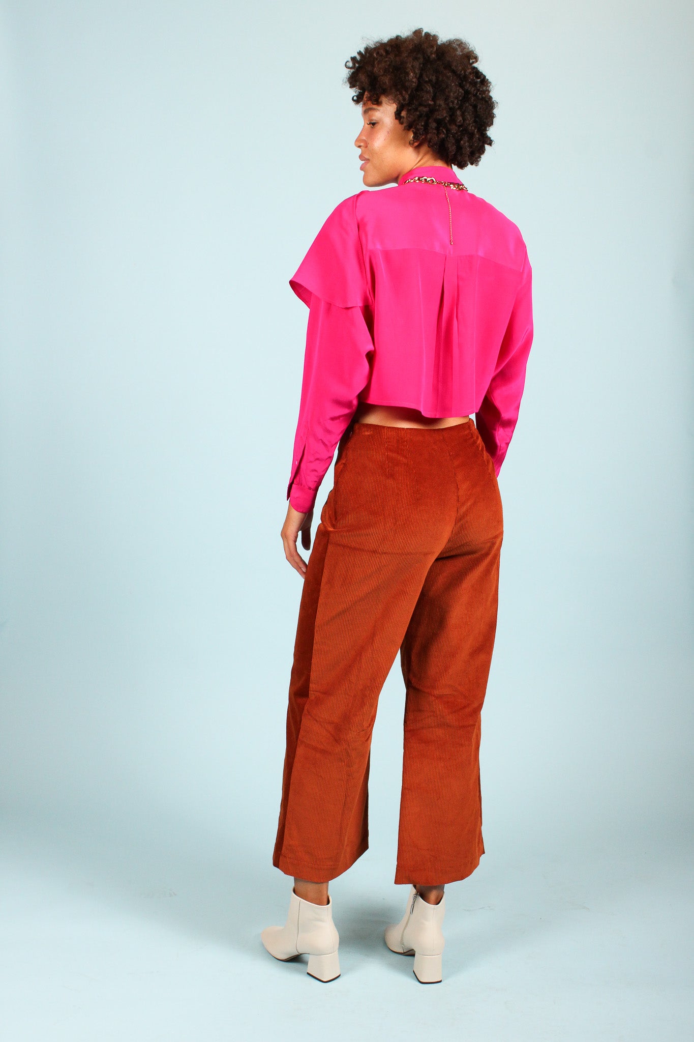 Made from salvaged vintage fabric, these pants feature a side zipper with a wide leg silhouette and cropped fit in a bright rusty orange corduroy and were handmade at Community.