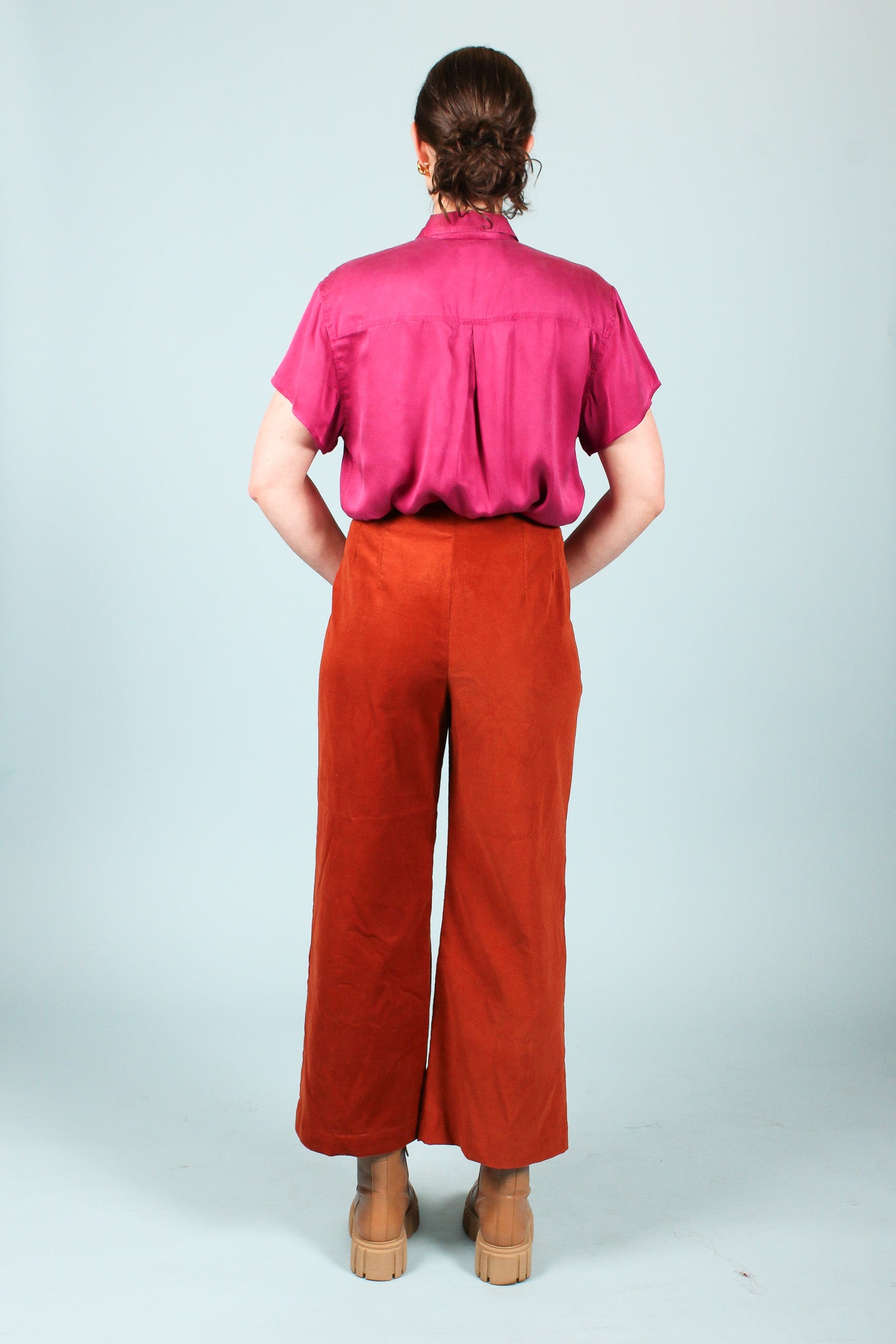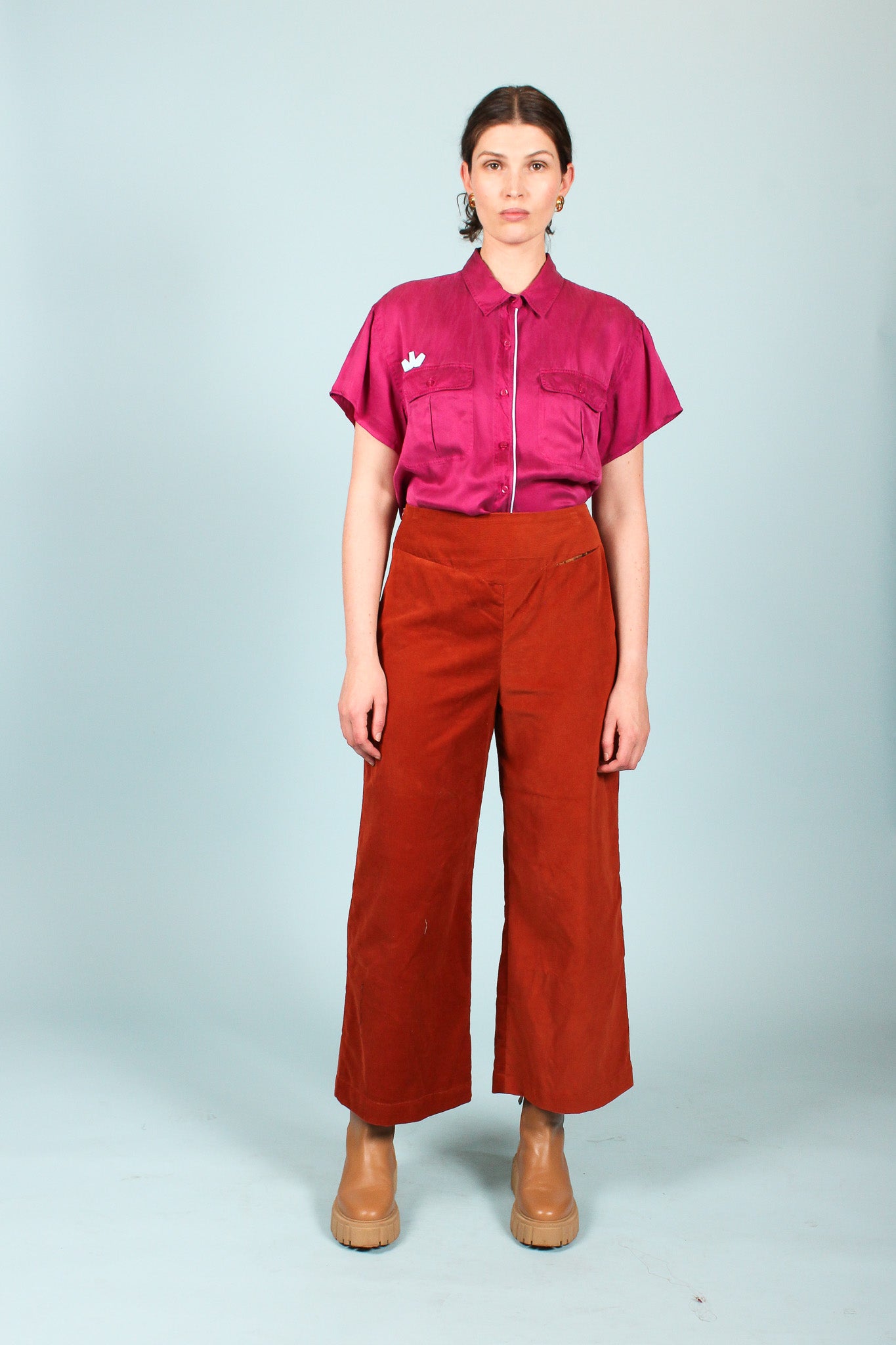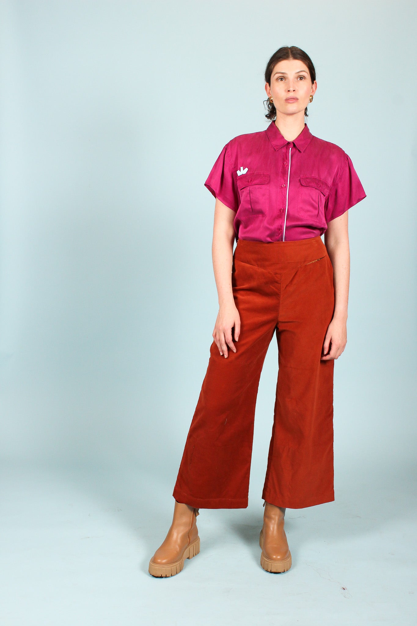 This redesigned vintage shirt features cropped sleeves, front pockets, collar, and a pale blue contrast stripe and crown detail above the right pocket against a washed fuchsia silk.