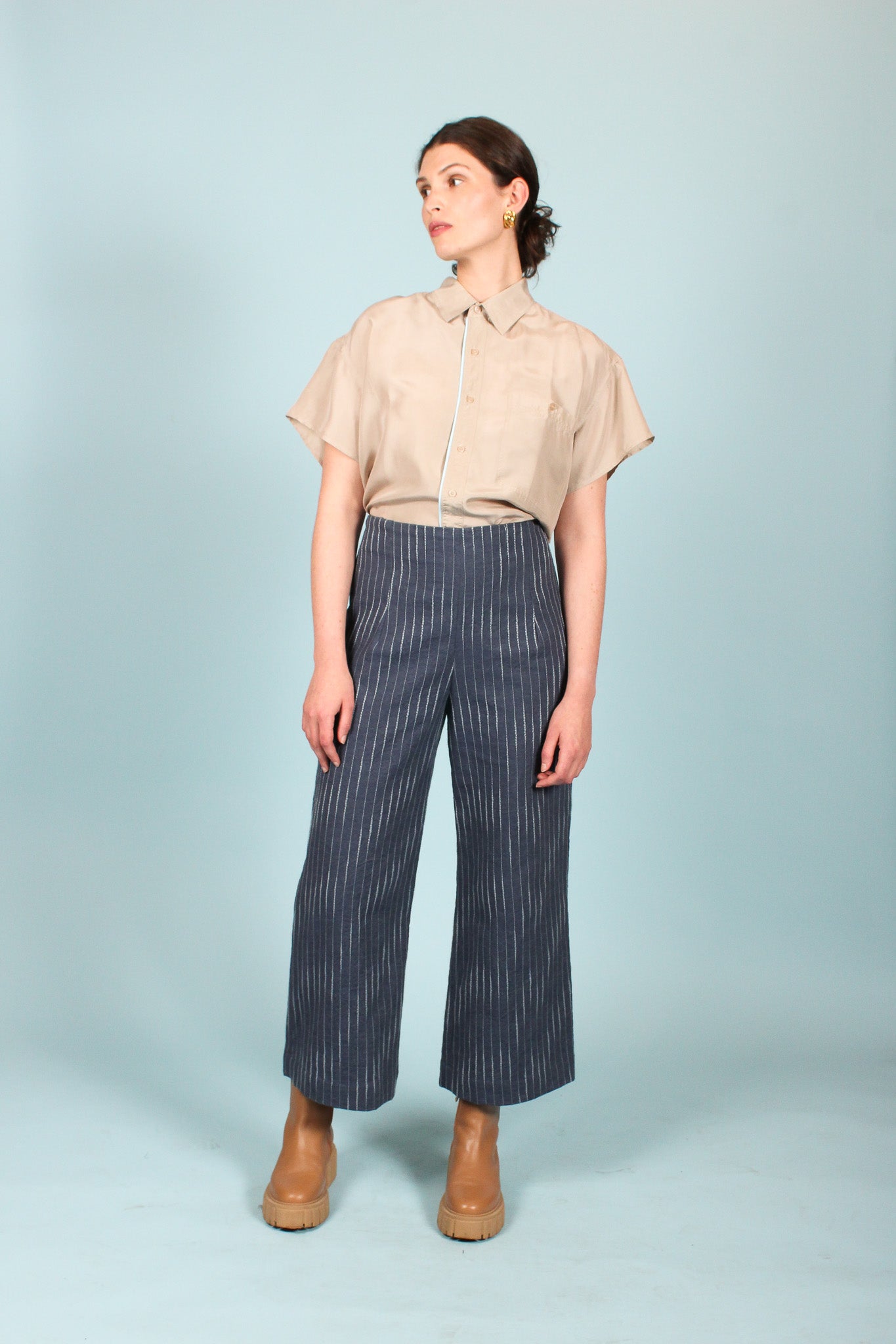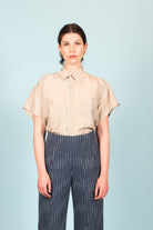 This redesigned vintage shirt features cropped flutter sleeves, one front pocket, collar, and a pale blue contrast stripe against a neutral khaki silk.