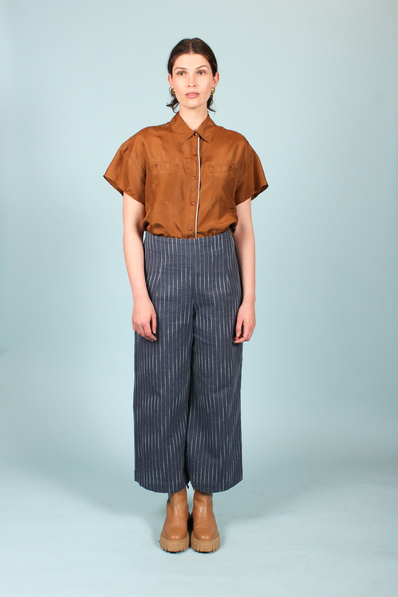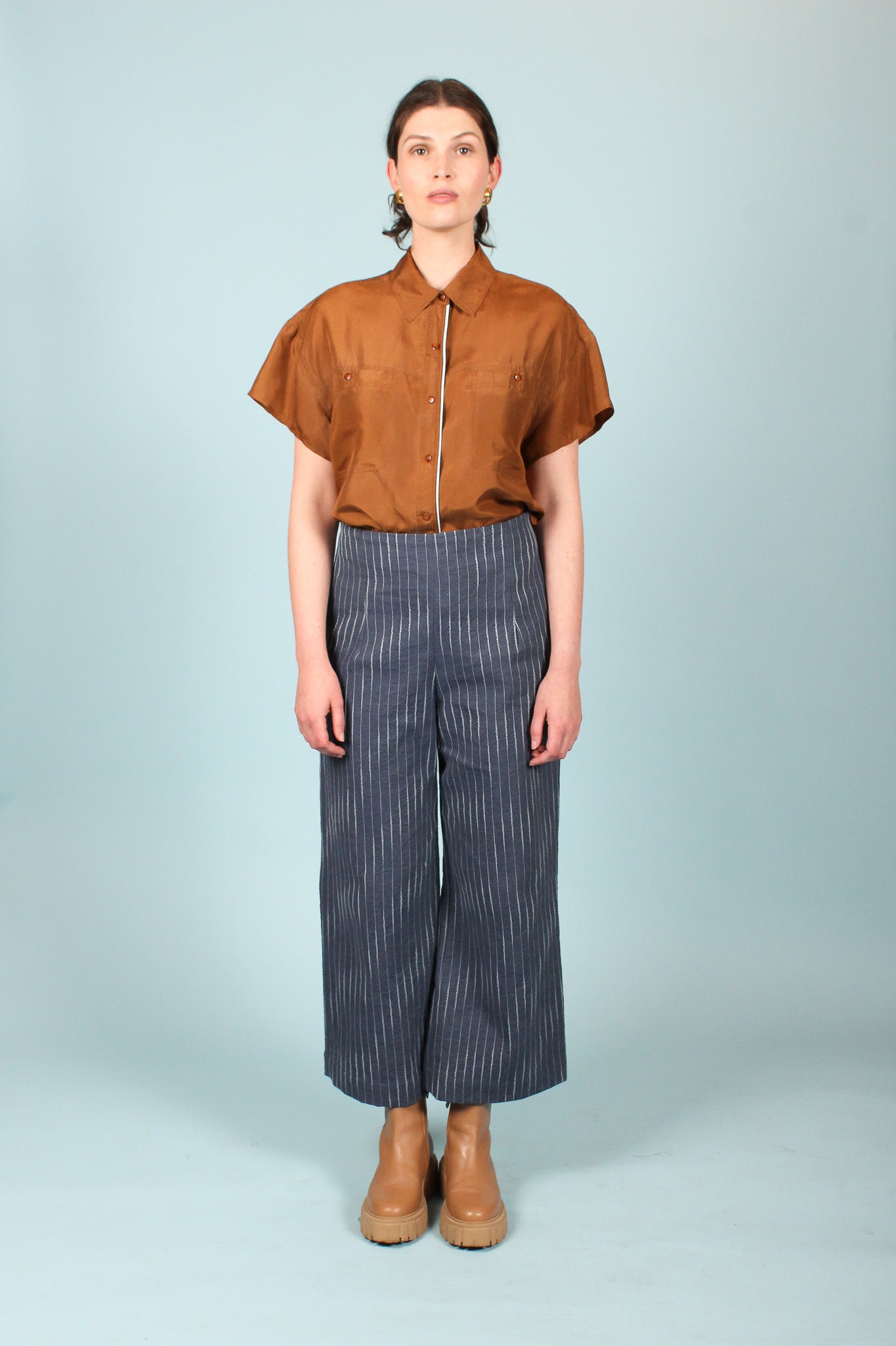 This redesigned vintage shirt features cropped flutter sleeves, front pockets, collar, and a pale blue contrast stripe against a warm nougat brown light silk.