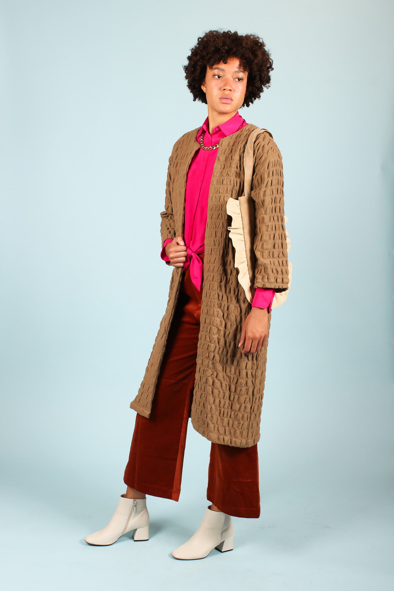 This minimalist walnut coat was handmade at Community in a textured cotton salvaged fabric with a quilted effect. It is unlined and finished with French Seams. It features a scoop neck, cropped sleeves, and drop shoulders. This is a perfect transitional piece, and also works great layered.
