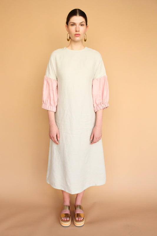 Handmade Lantern Sleeve Linen Midi Dress in Moon + Rose Size S