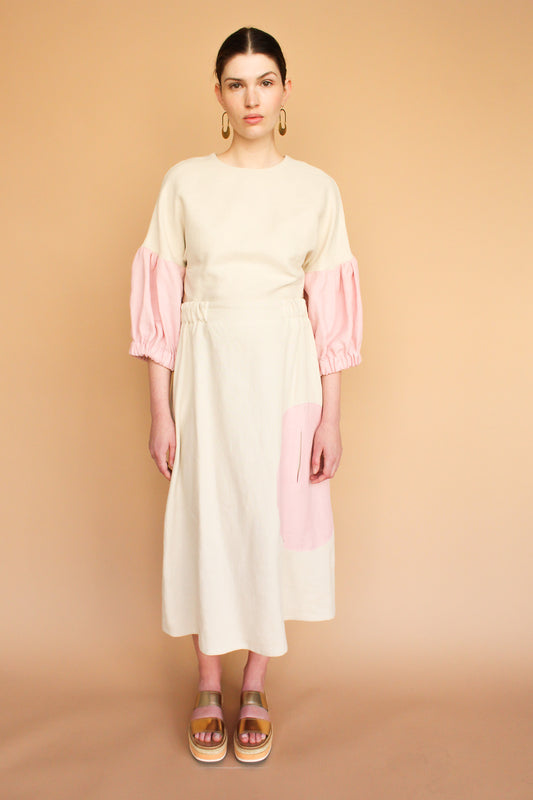 Handmade Lantern Sleeve Linen Top in Natural + Rose Size M