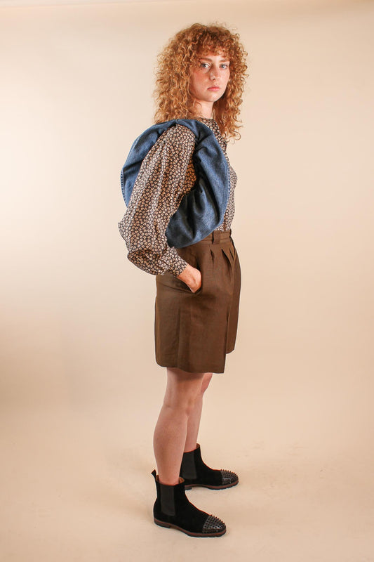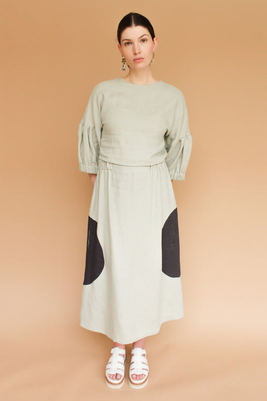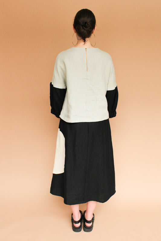 Handmade Lantern Sleeve Linen Top in Stone + Onyx Size L