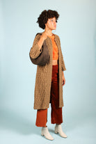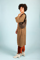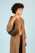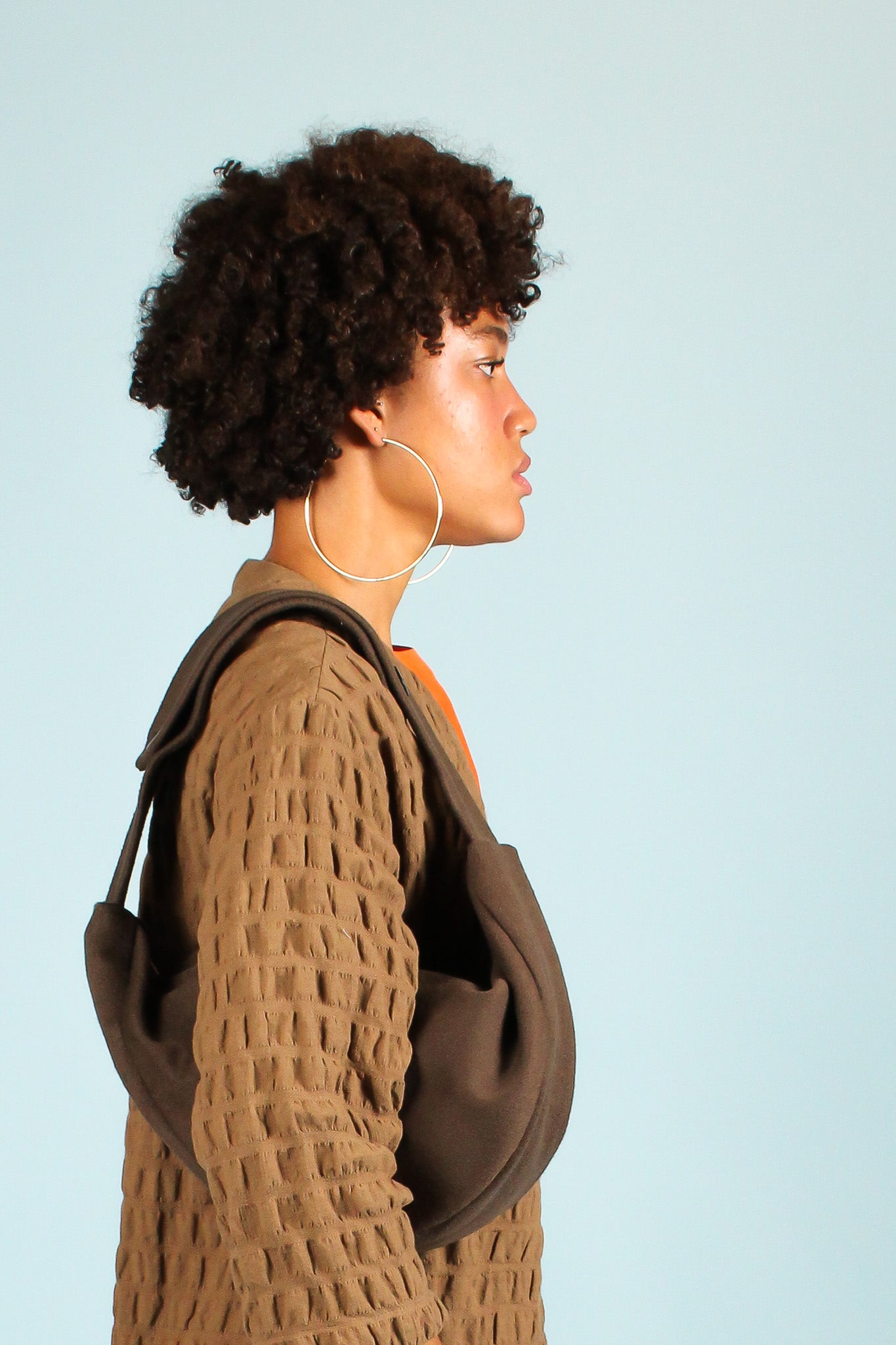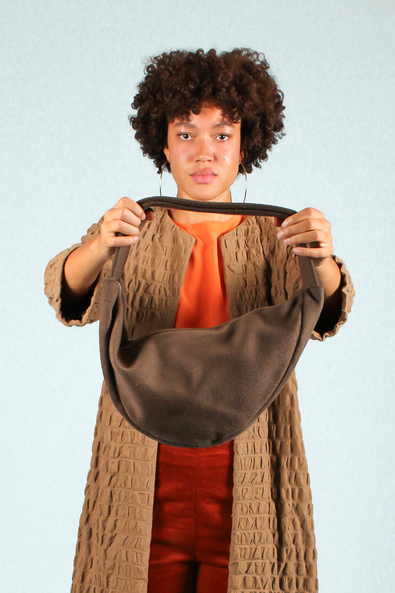 This minimalist sling bag was upcycled here at Community from a vintage coat in a neutral walnut brown. It features a semi circle shape with two buttons in the strap and a silver zipper. Wool has minor flaws due to the use of vintage material. Bag is fully lined.