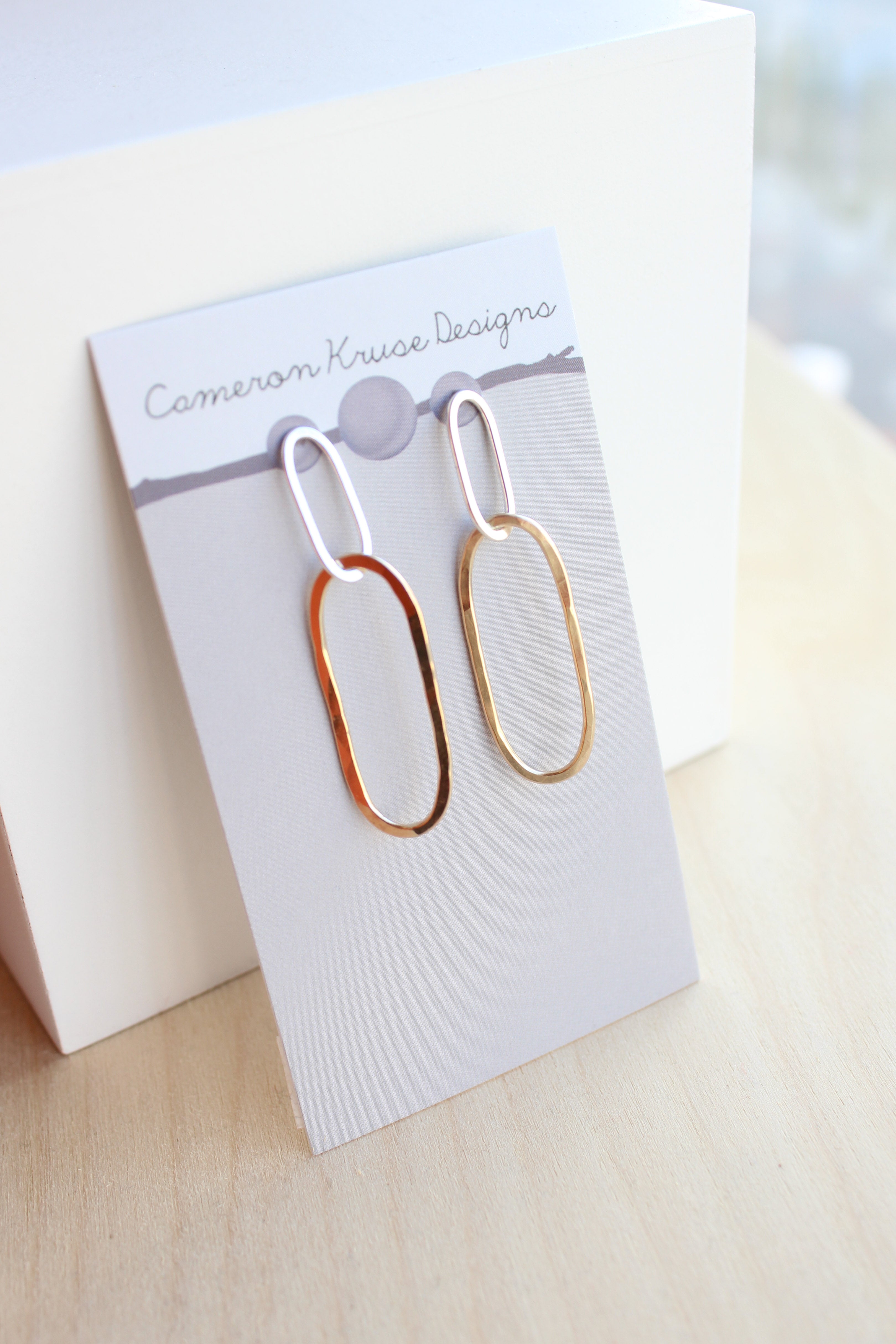 Interlocking oval shapes create a unique silhouette that looks great from all angles.Materials: Sterling silver and 14 karat gold-filled
