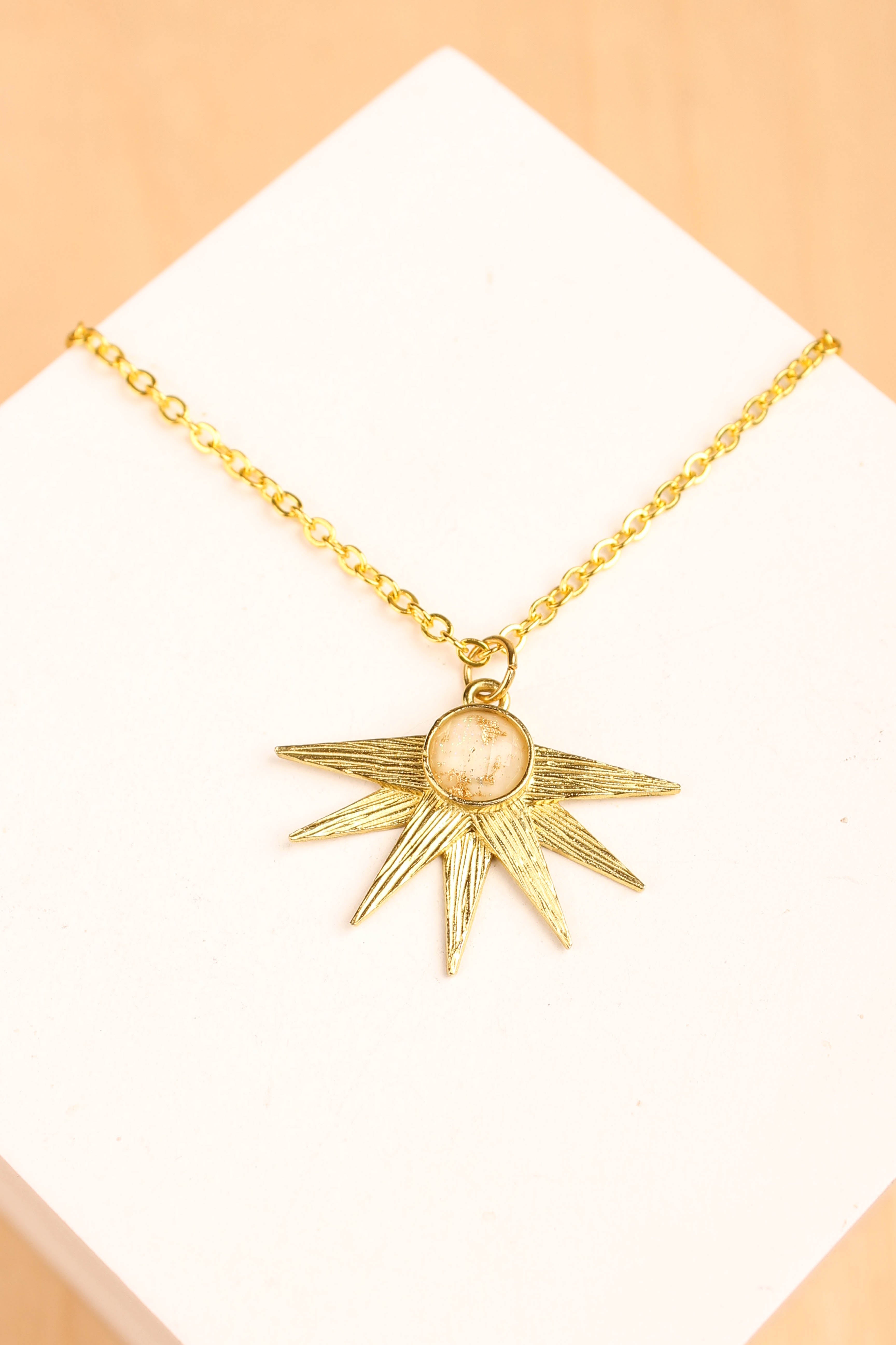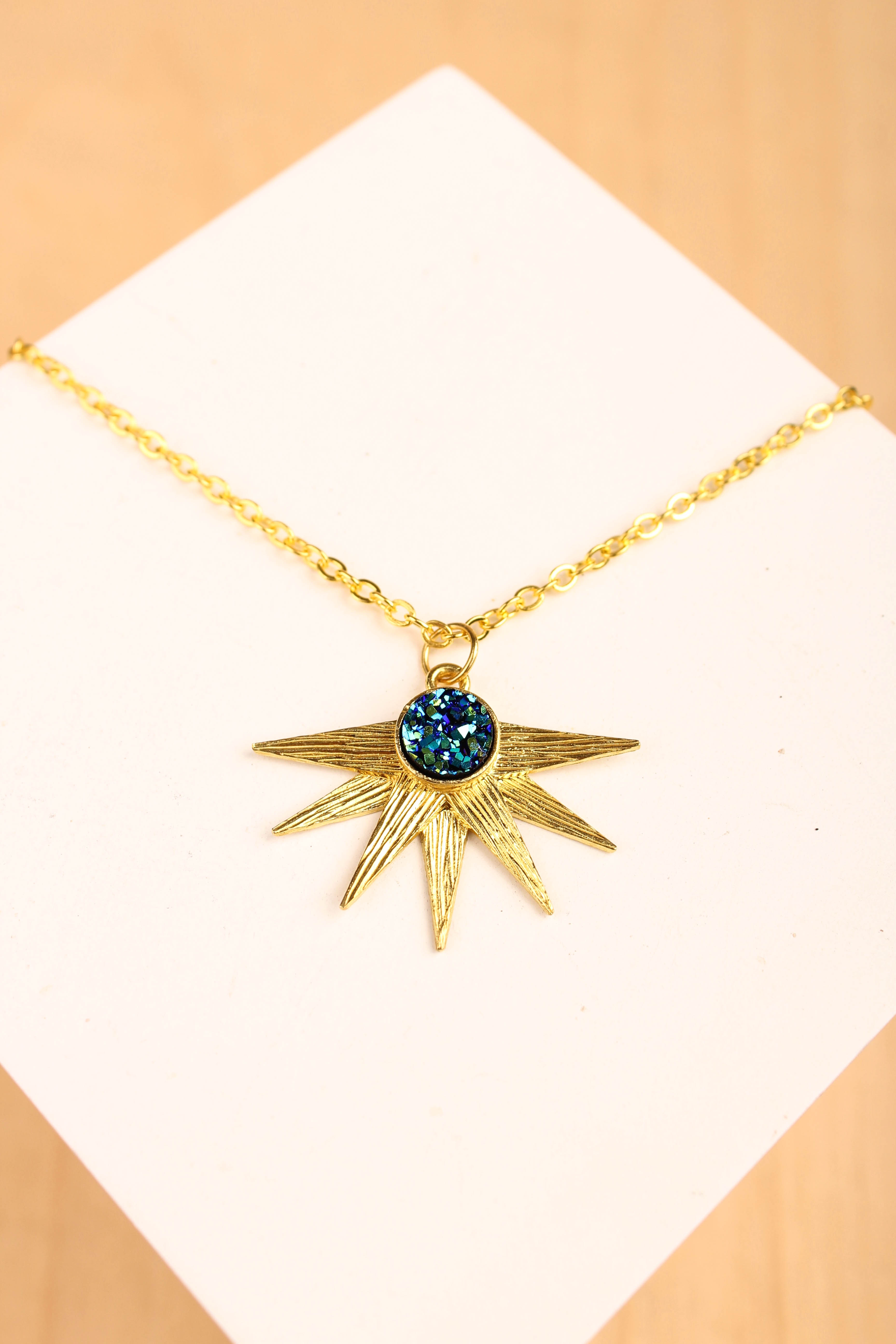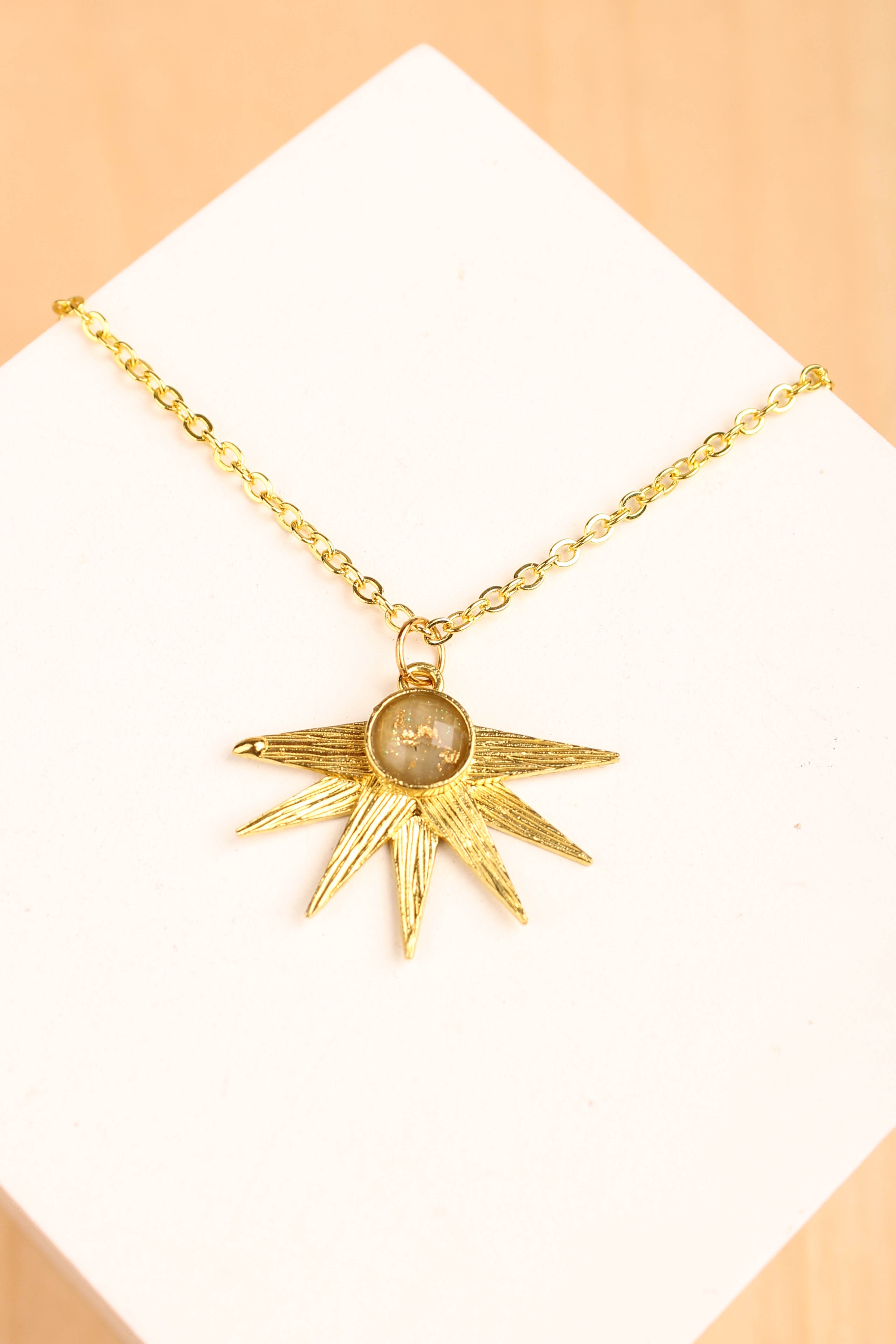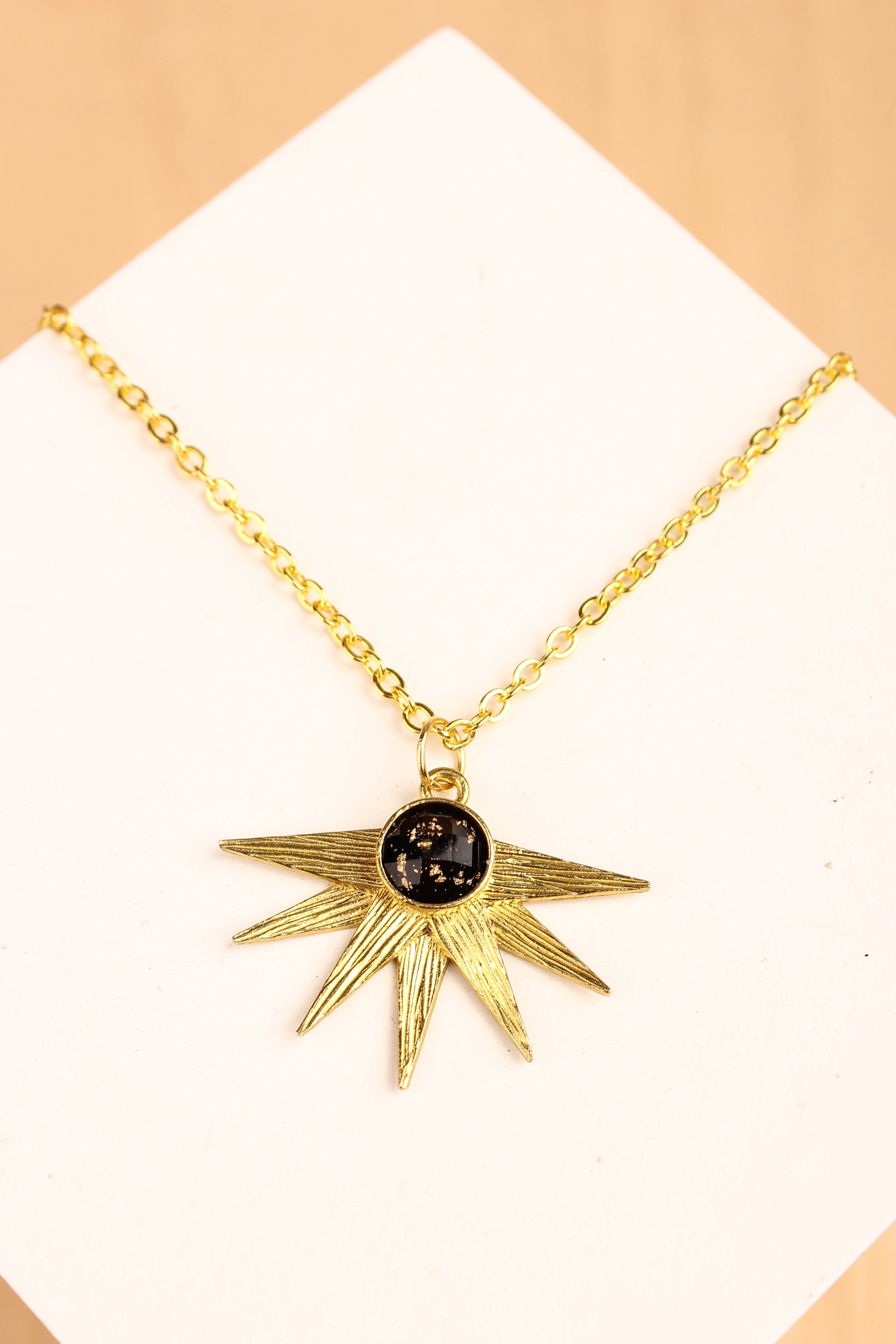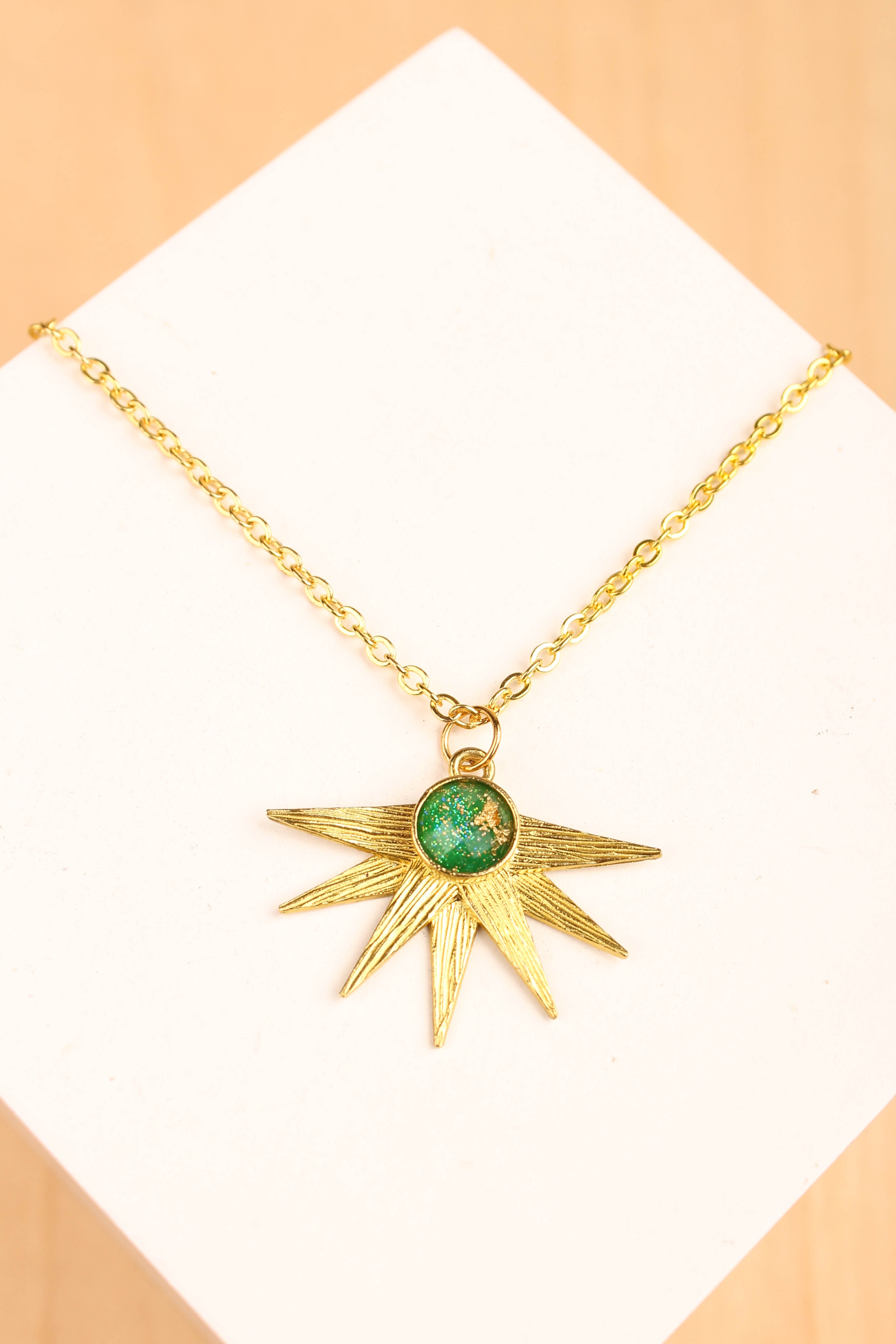 The Radiant Necklace is gold plated charm with choice of color of gold flake or textured resin center. The chain is gold plated and measures 18”.