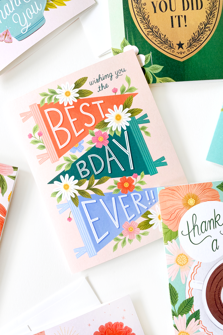 This hand-illustrated birthday card features 3 cheerful pennant banners, blooming with sweet florals and leaves, and a hand-lettered message. Blank on the inside for your sentiments.