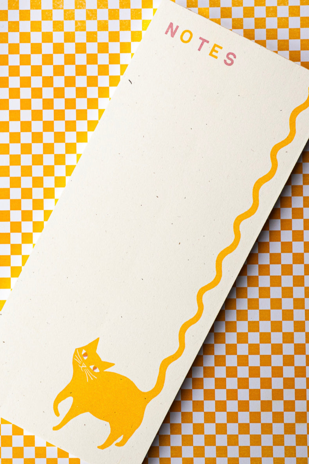 Squiggly Tail Notepad features the word "NOTES" at the top in alternating colors and 52 tear-off sheets on a chipboard backer. Risograph printed in light mauve pink and sunflower yellow.