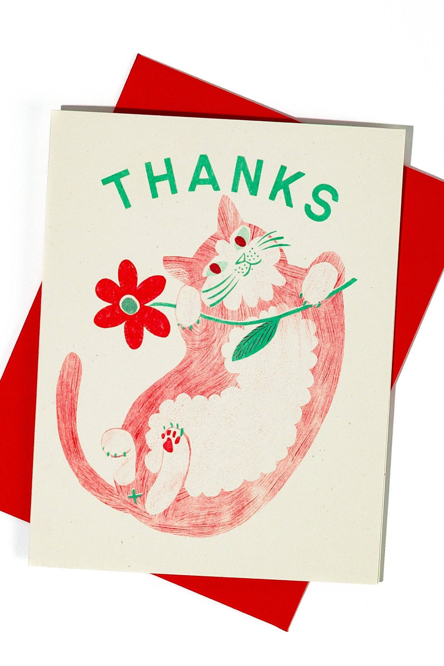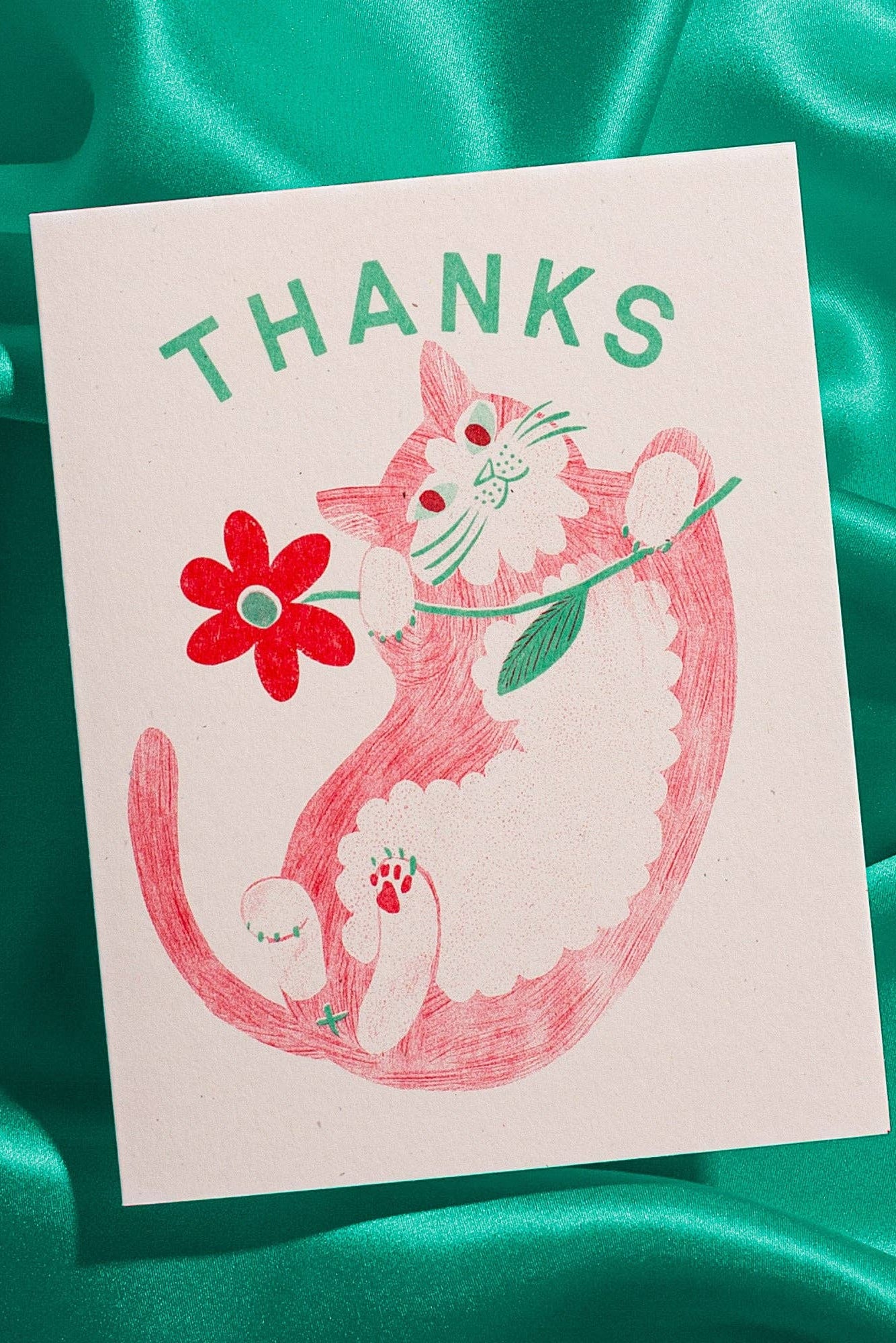 This cute cat offers a flower in thanks. Risograph printed in seafoam and bright red.