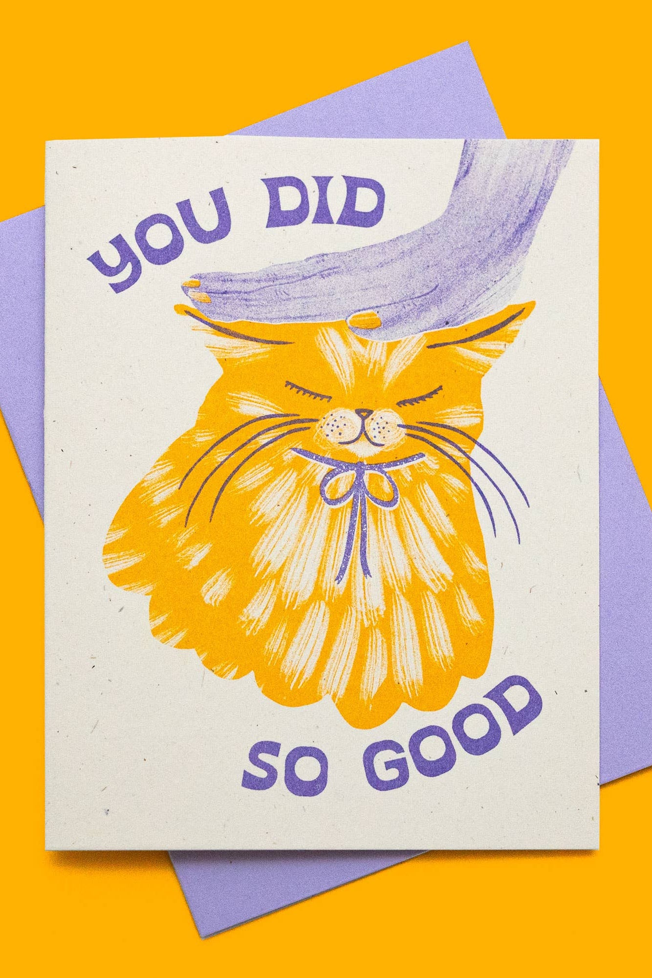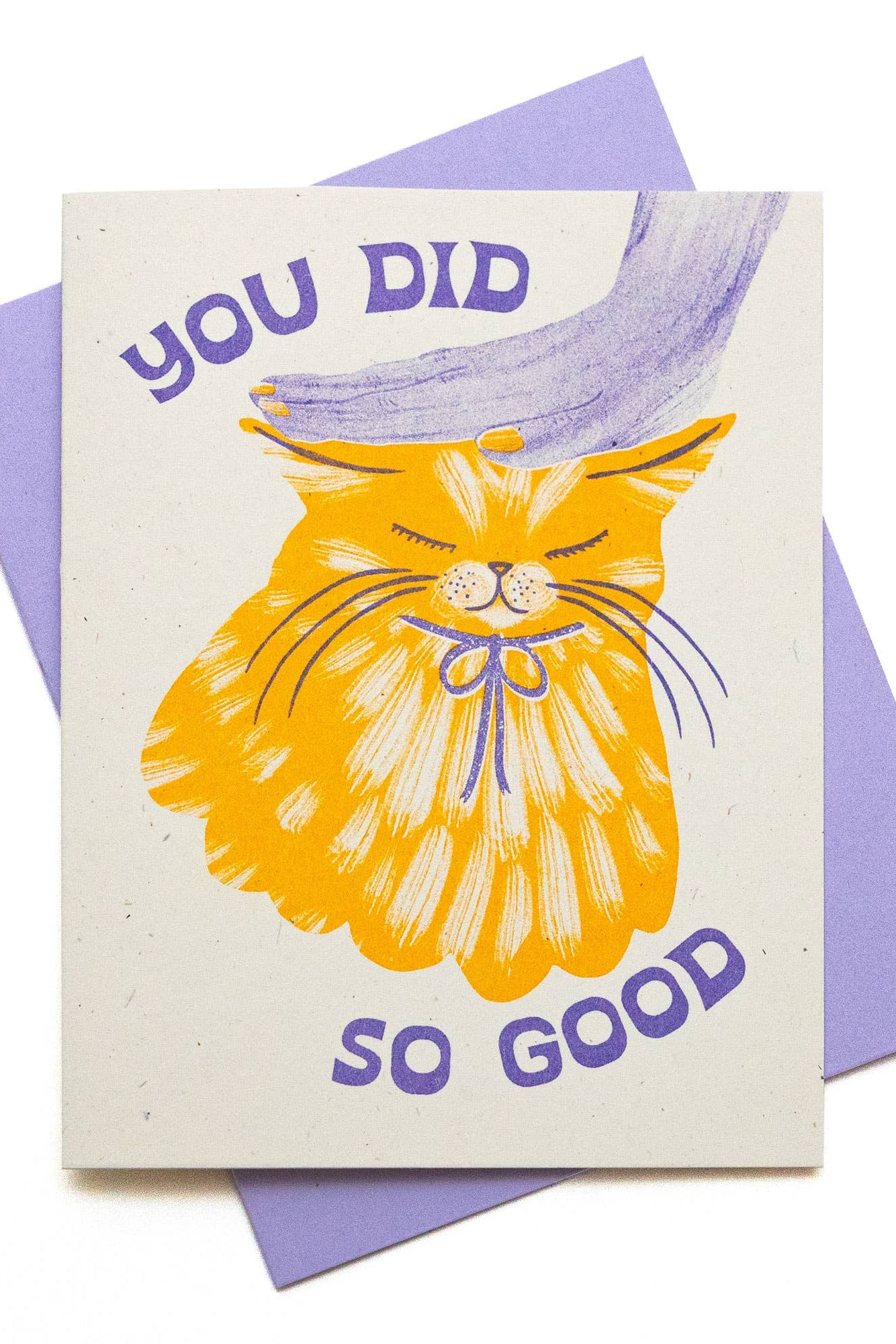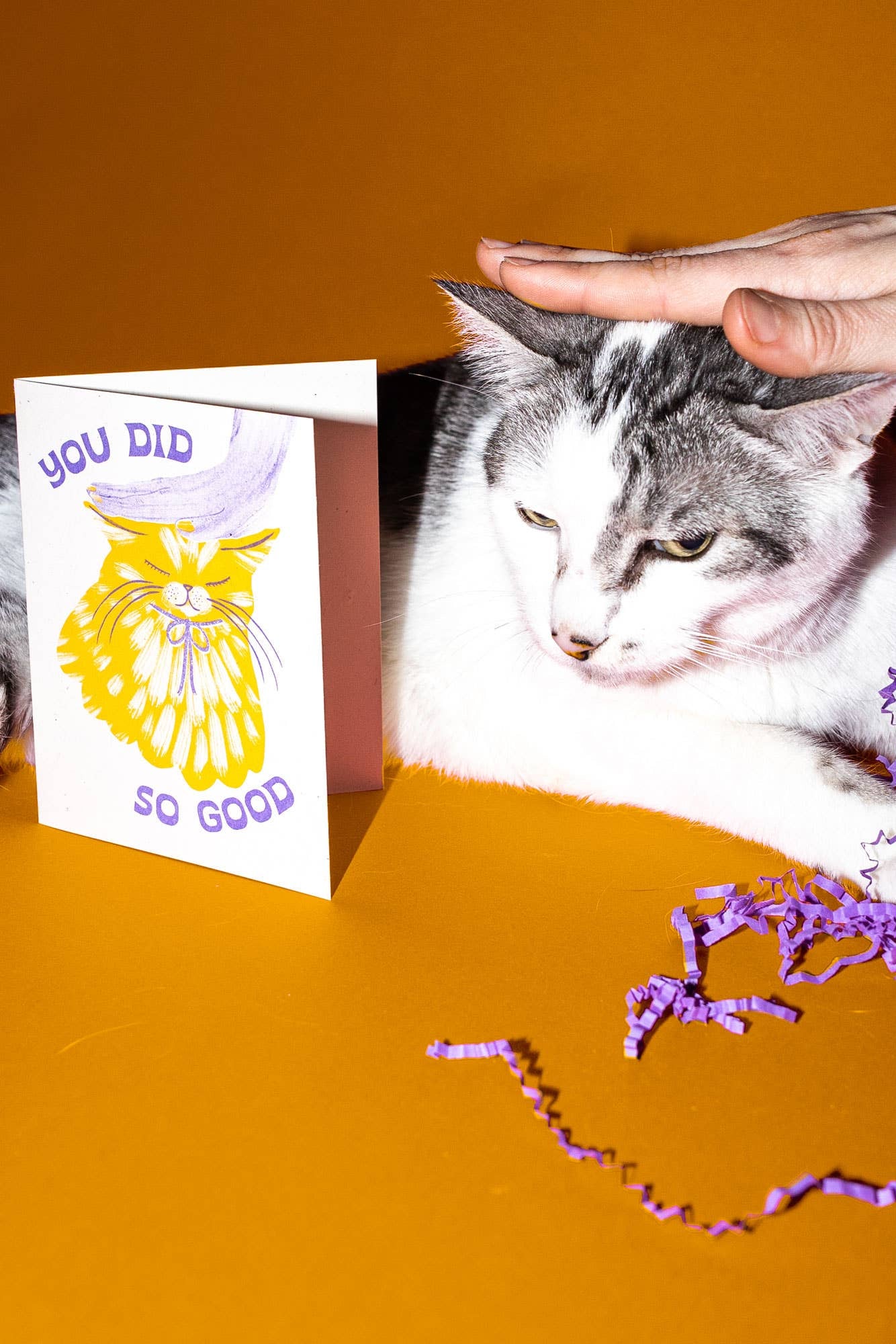 A card of congratulations and encouragement. This kitty gets a nice little head pat for a job well done. Risograph printed in sunflower yellow and violet.