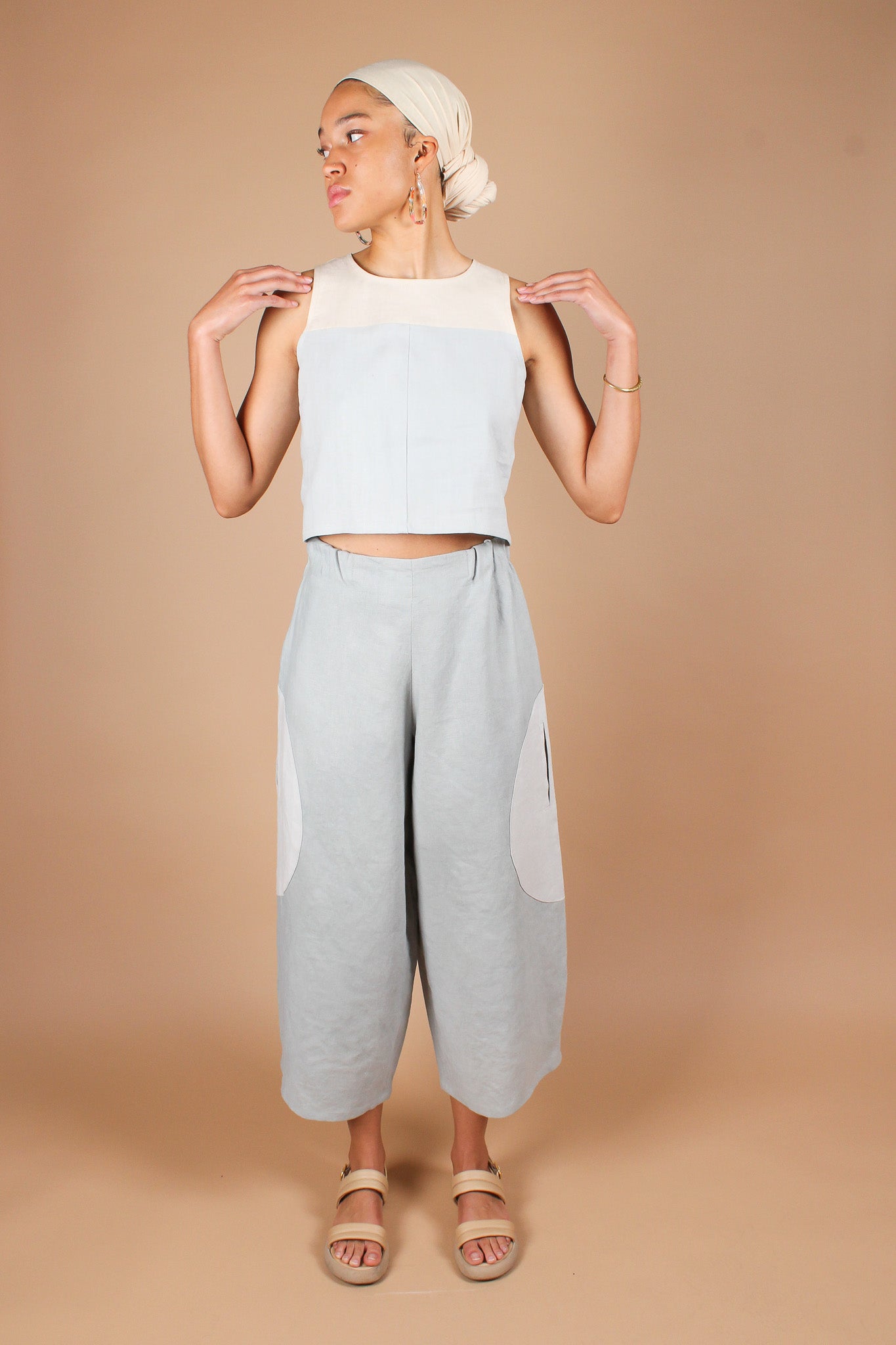 Big Circle Hand-Dyed Linen Pants in Dusty Blue and Ice Size L