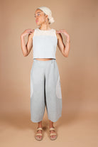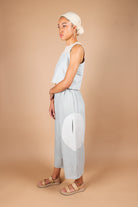 Inspired by a favorite pair of vintage pants, these were handmade from heavy weight salvaged linen that was hand-dyed by our team. The wide-leg silhouette subtly tapers at the bottom, and the waistband is flat across the middle, but has elastic on the sides for a comfortable fit. The extra large circle pockets in the same color add a fun and practical design detail.