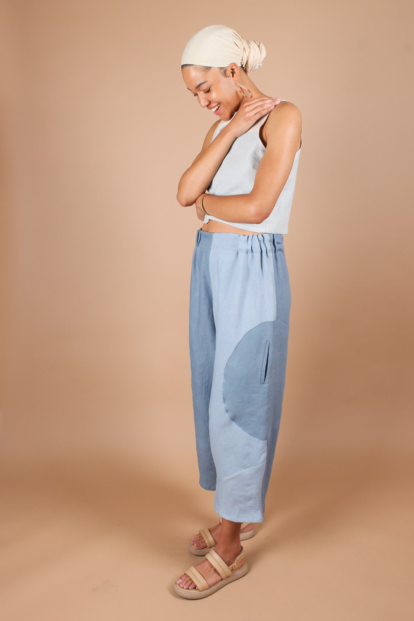Hand-Dyed Circle Pocket Linen Pants in Blue Bell