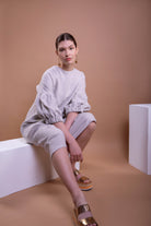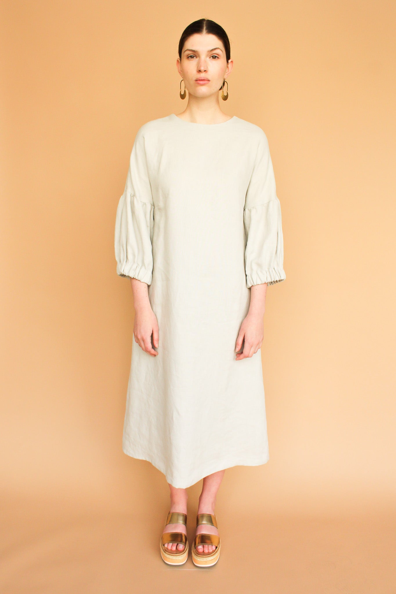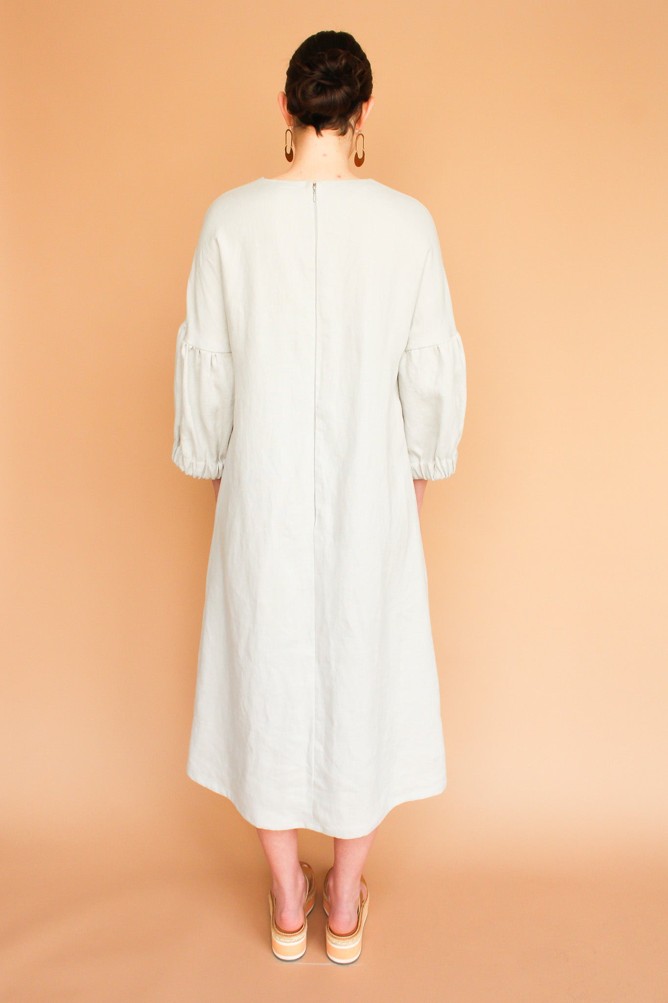 Made from heavy, but breathable deadstock linen, this light grey dress was handmade at Community and features a dropped shoulder with 3/4 length lantern sleeves with elastic, bust darts, and an invisible zipper and hook & eye closure in the back.