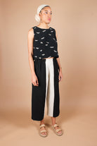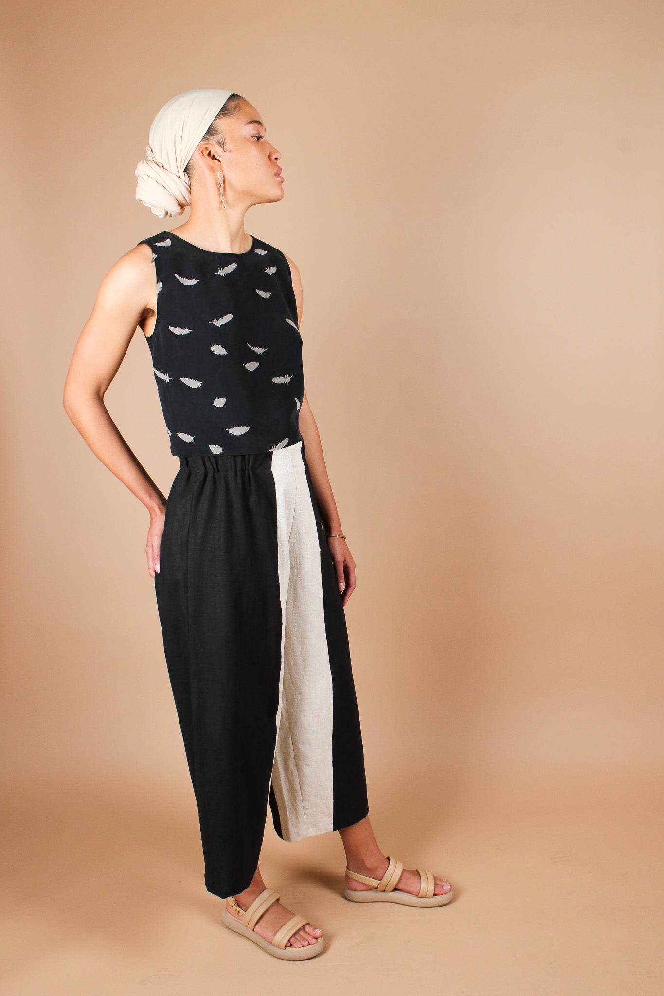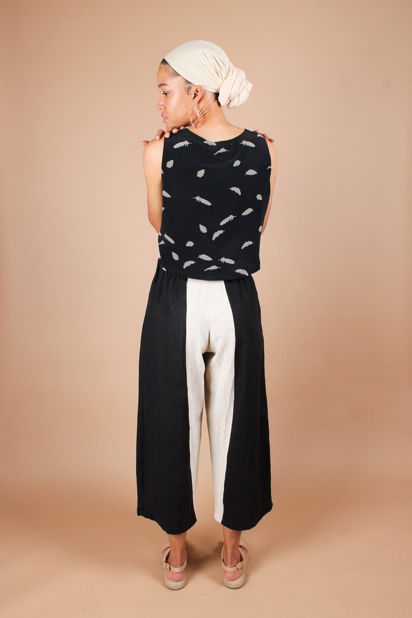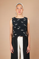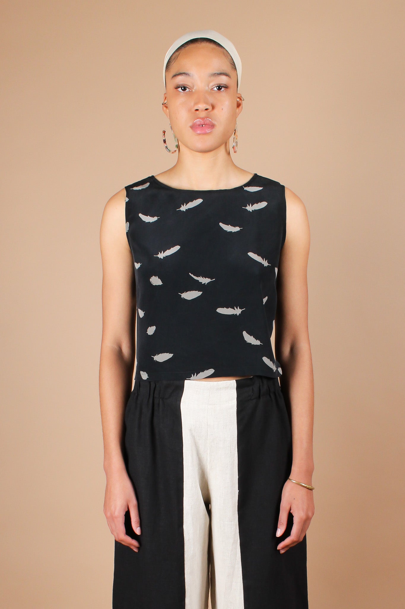 This cropped tank was handmade at Community and features delicate grey feathers on a black silk background.