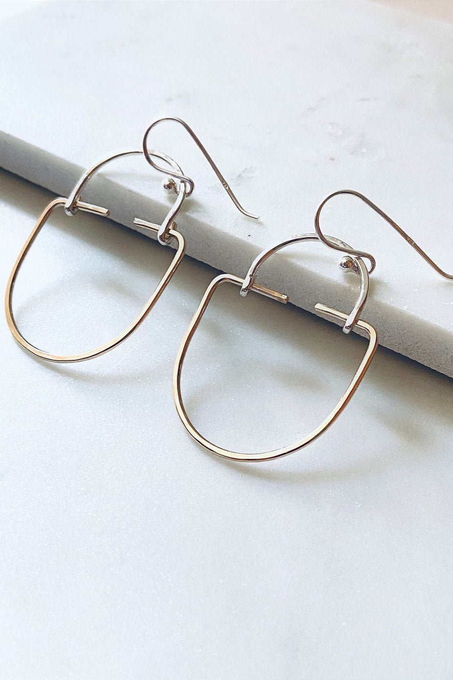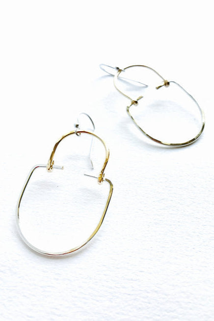 These elegant earrings are mixed metal 14K gold filled and sterling silver. They are hand shaped and hammered for a minimal art deco look. Sterling silver ear wires are added. The hoops are polished for extra shine and to harden the metal.