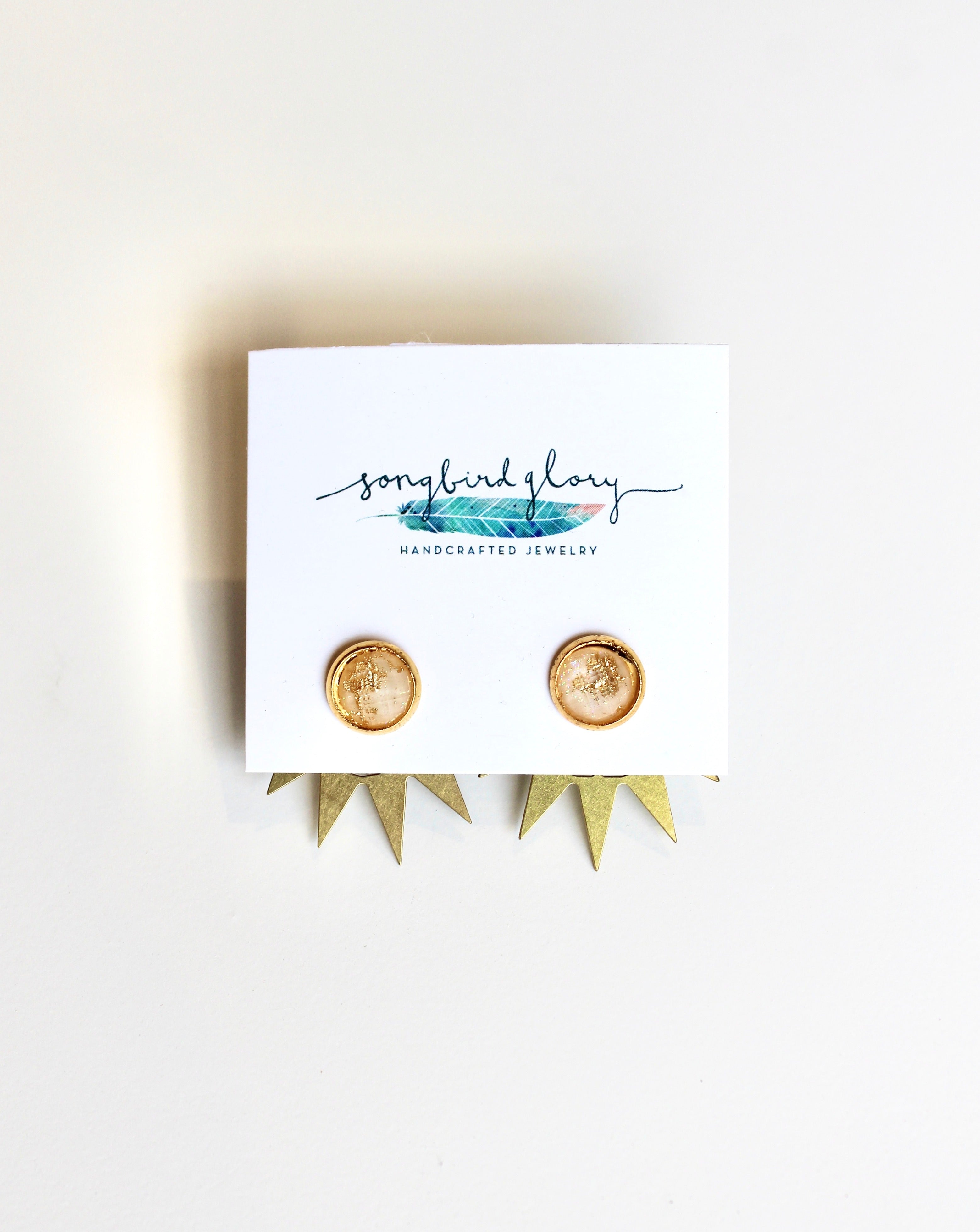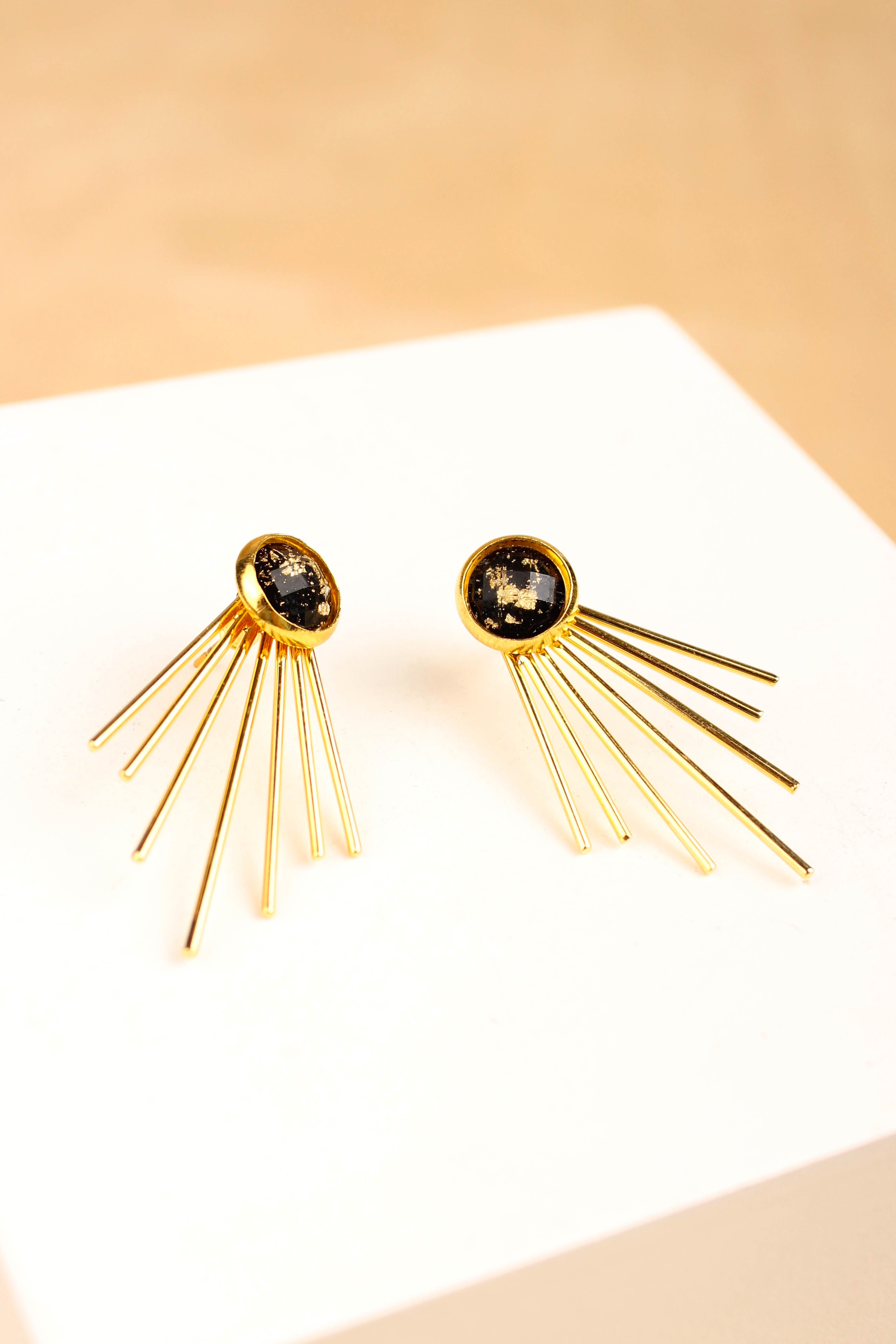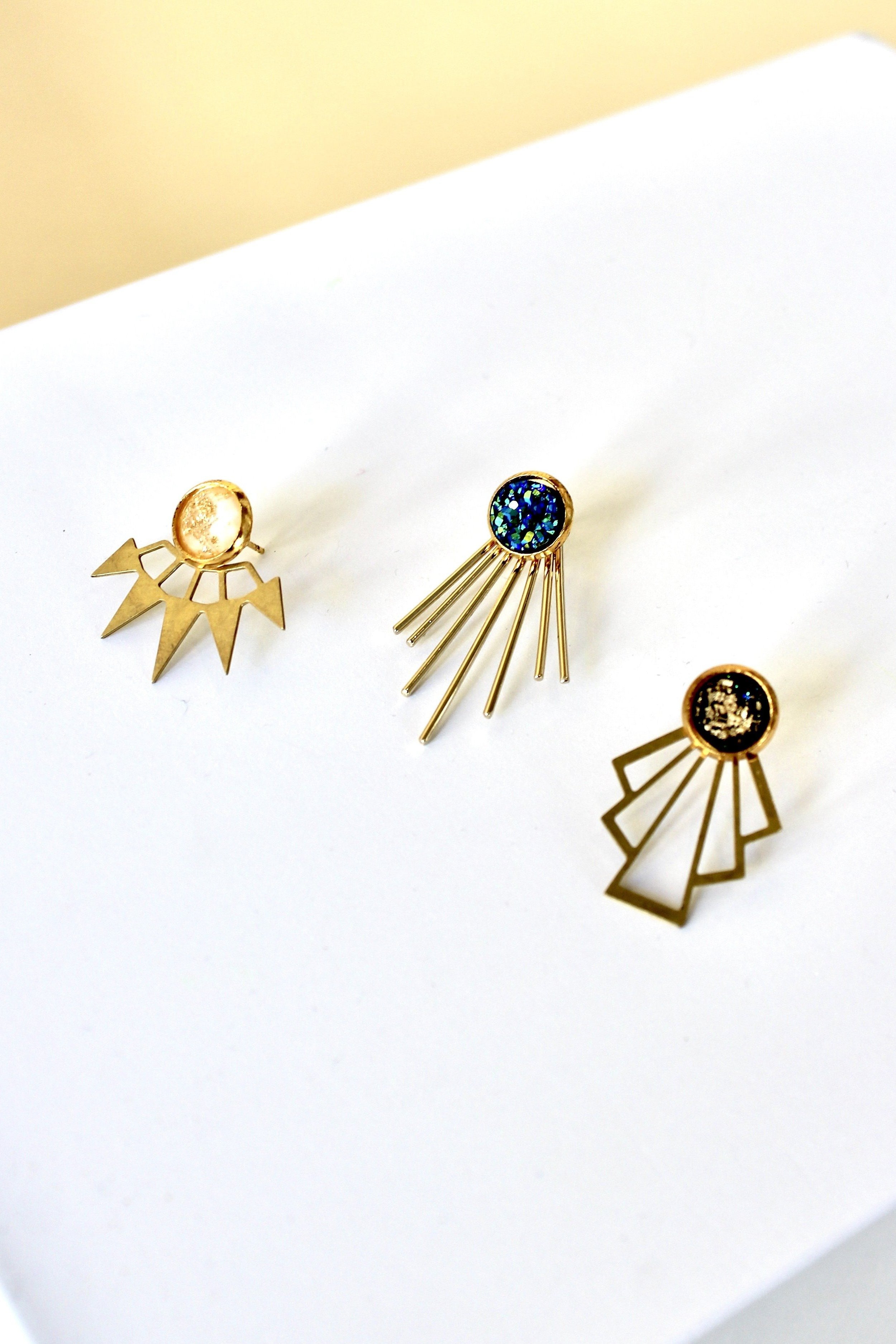 Wear the stud in front and the rays/spikes behind your earlobe, or combine them in front for one fierce stud set. Ear Jackets are gold plated brass, studs are resin in gold plated brass. Nickel and lead free.