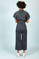 This redesigned vintage shirt features cropped sleeves, front pockets, collar, and a cream contrast stripe against a washed black silk.