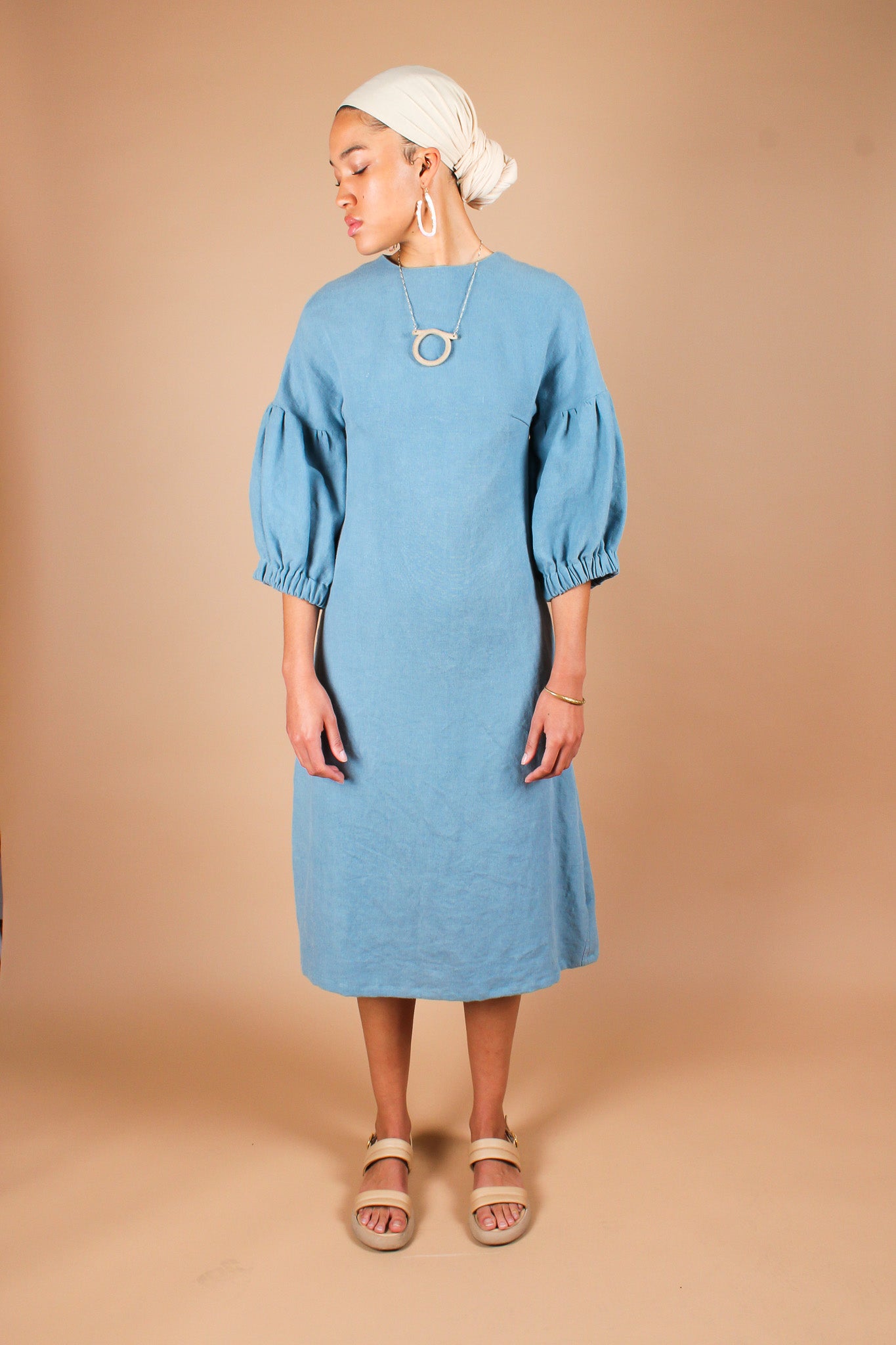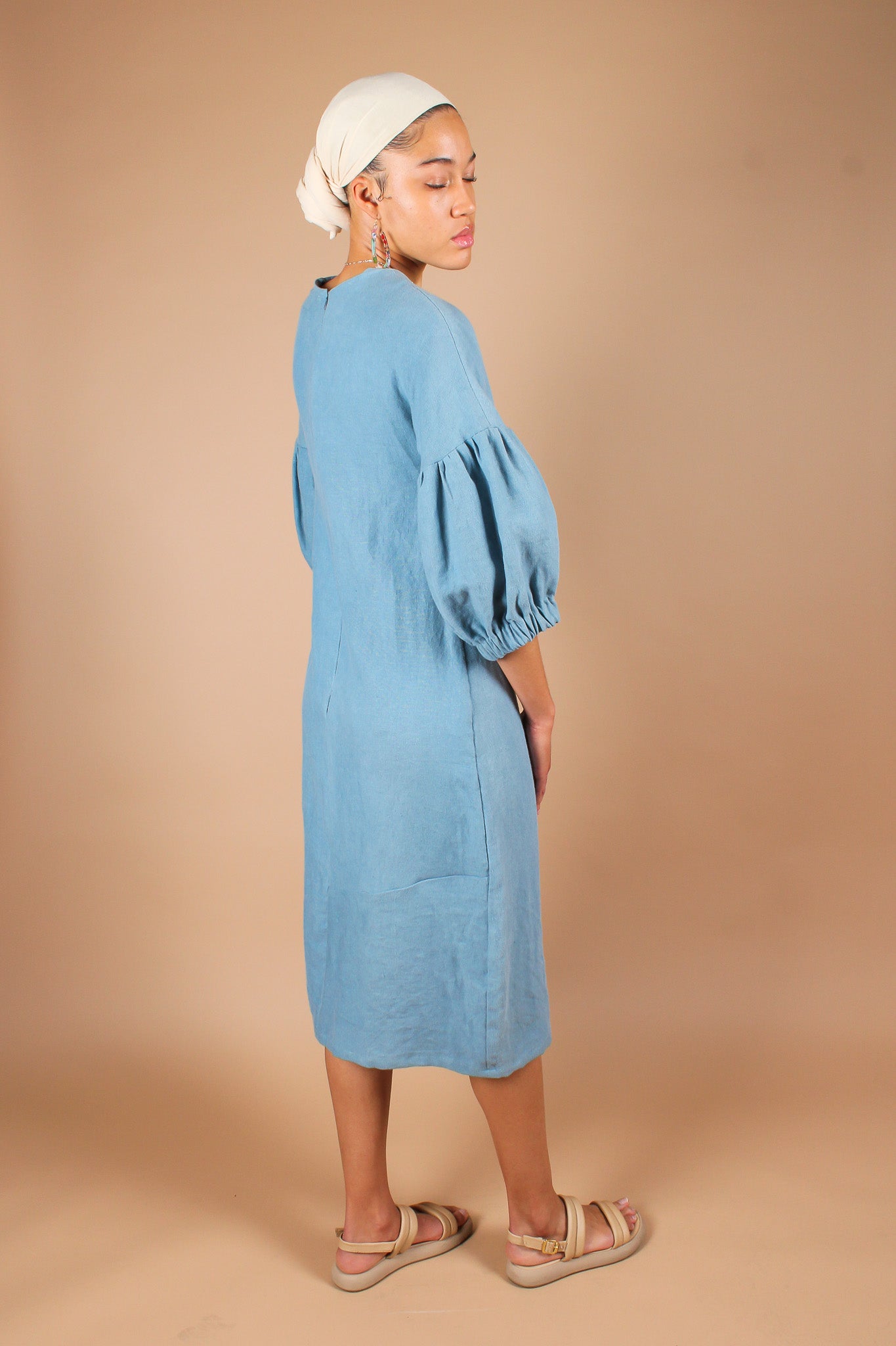 Handmade Lantern Sleeve Linen Midi Dress in Pond