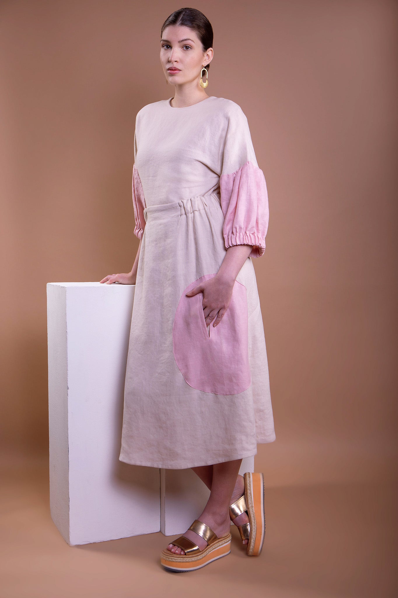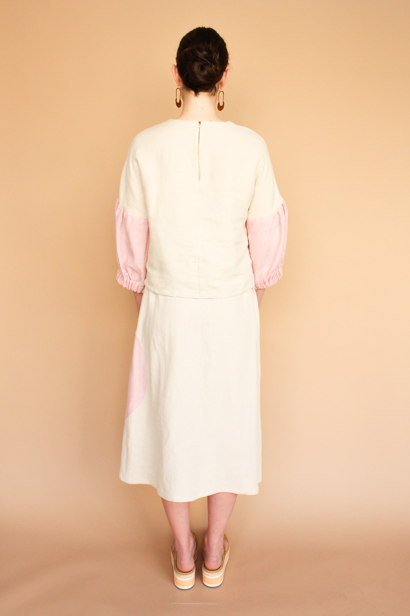 Handmade Lantern Sleeve Linen Top in Natural + Rose Size M