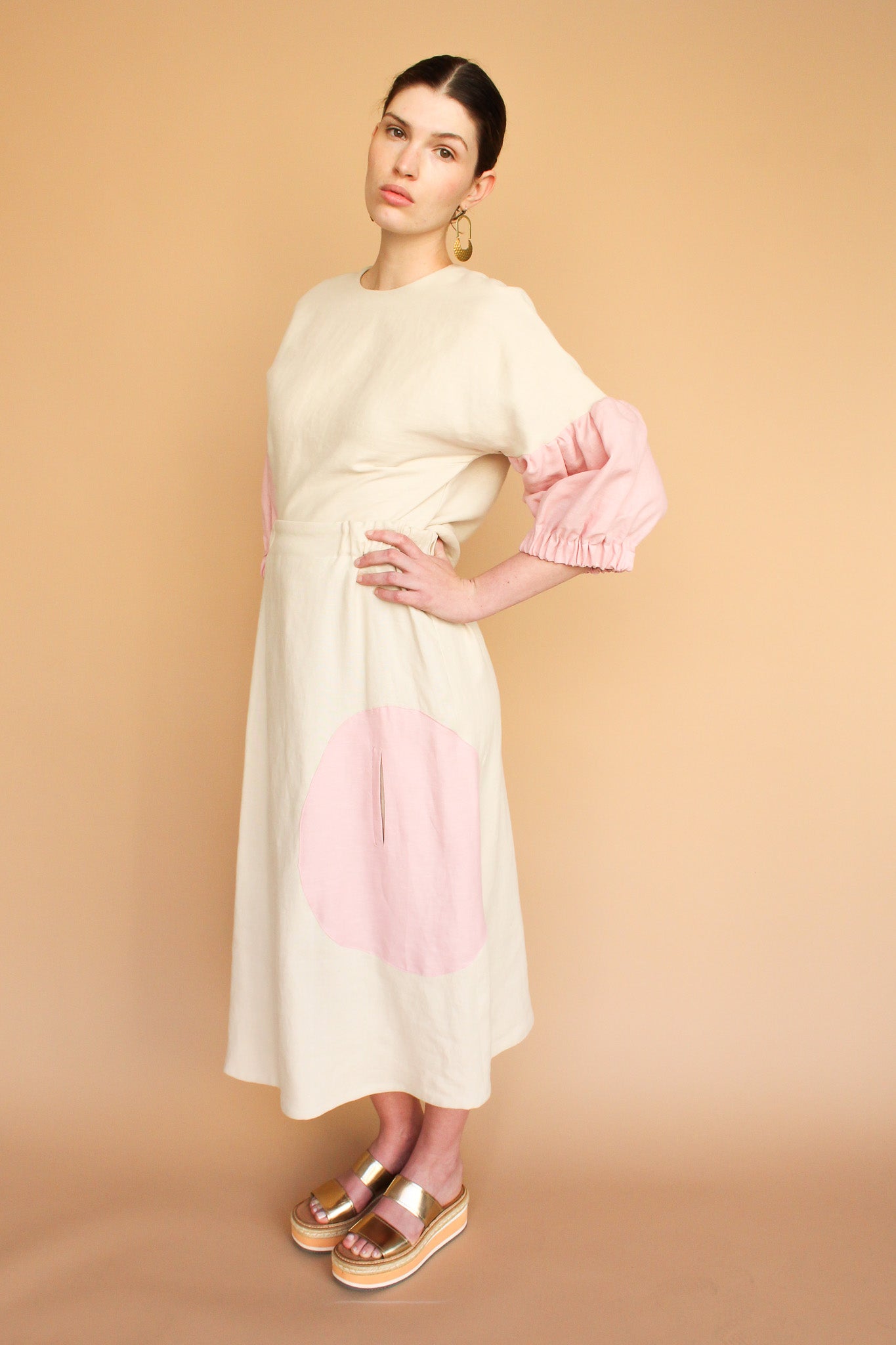 Made from heavy, but breathable deadstock linen, this top was handmade at Community and features a dropped shoulder with 3/4 length lantern sleeves with elastic, a contrasting brass colored metal zipper in the back, and bust darts. Two-tone design with cream bodice and rose sleeves.