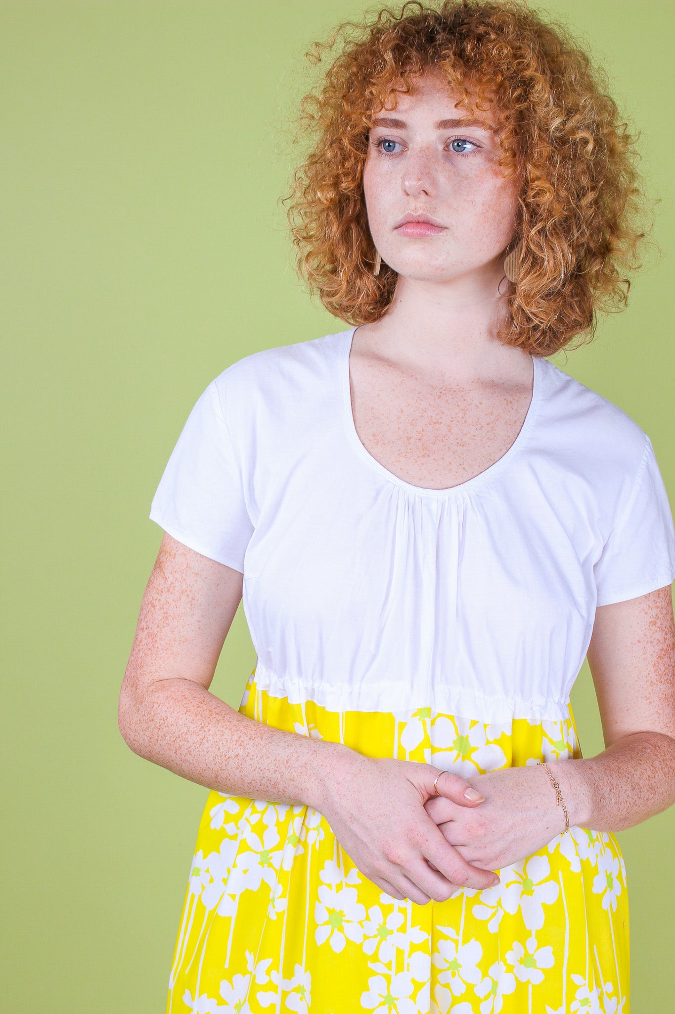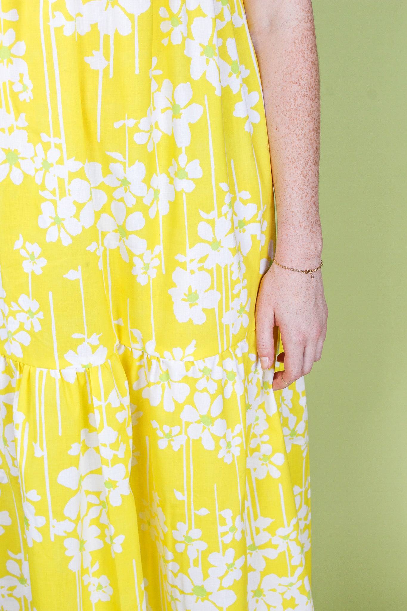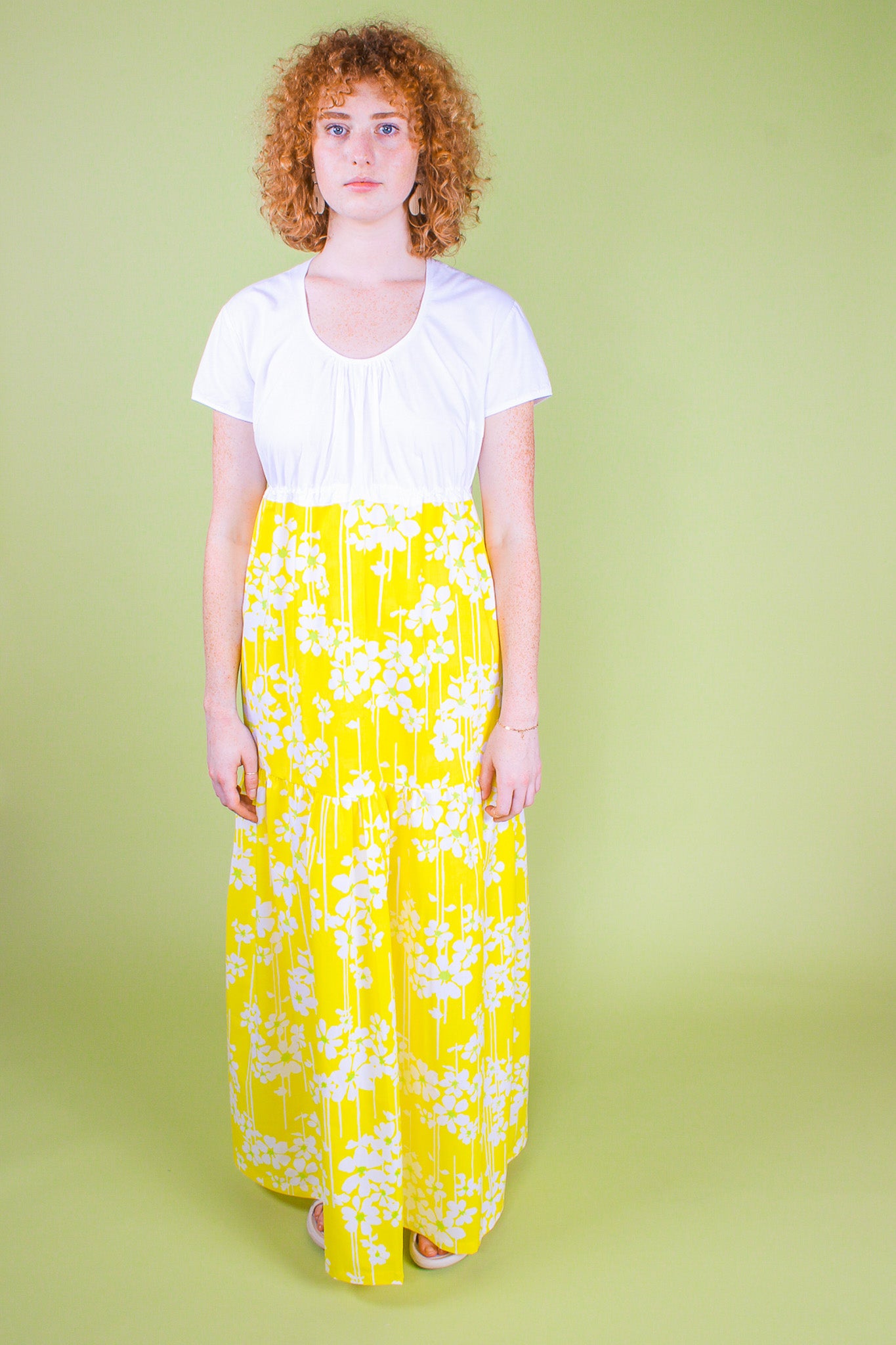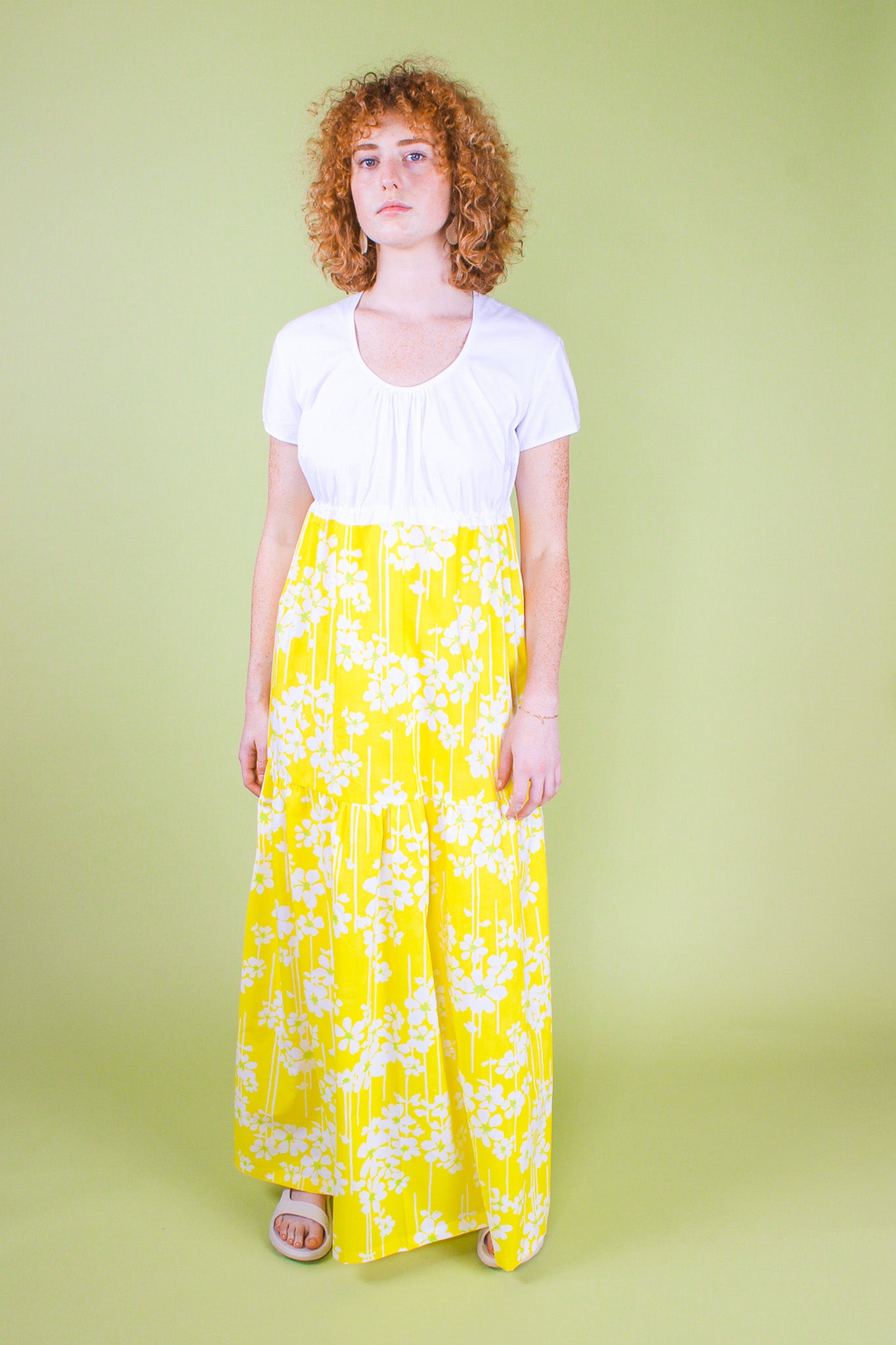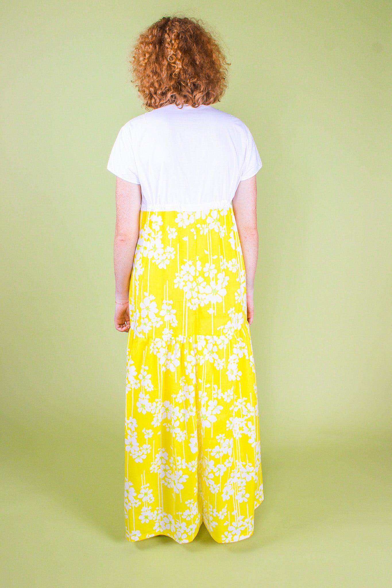 This sunny floral dress is upcycled from vintage materials and features a gathered, tiered design with a contrasting crisp white top with short sleeves and a scooped neckline. The gathering of the top is adjustable by an internal drawstring.